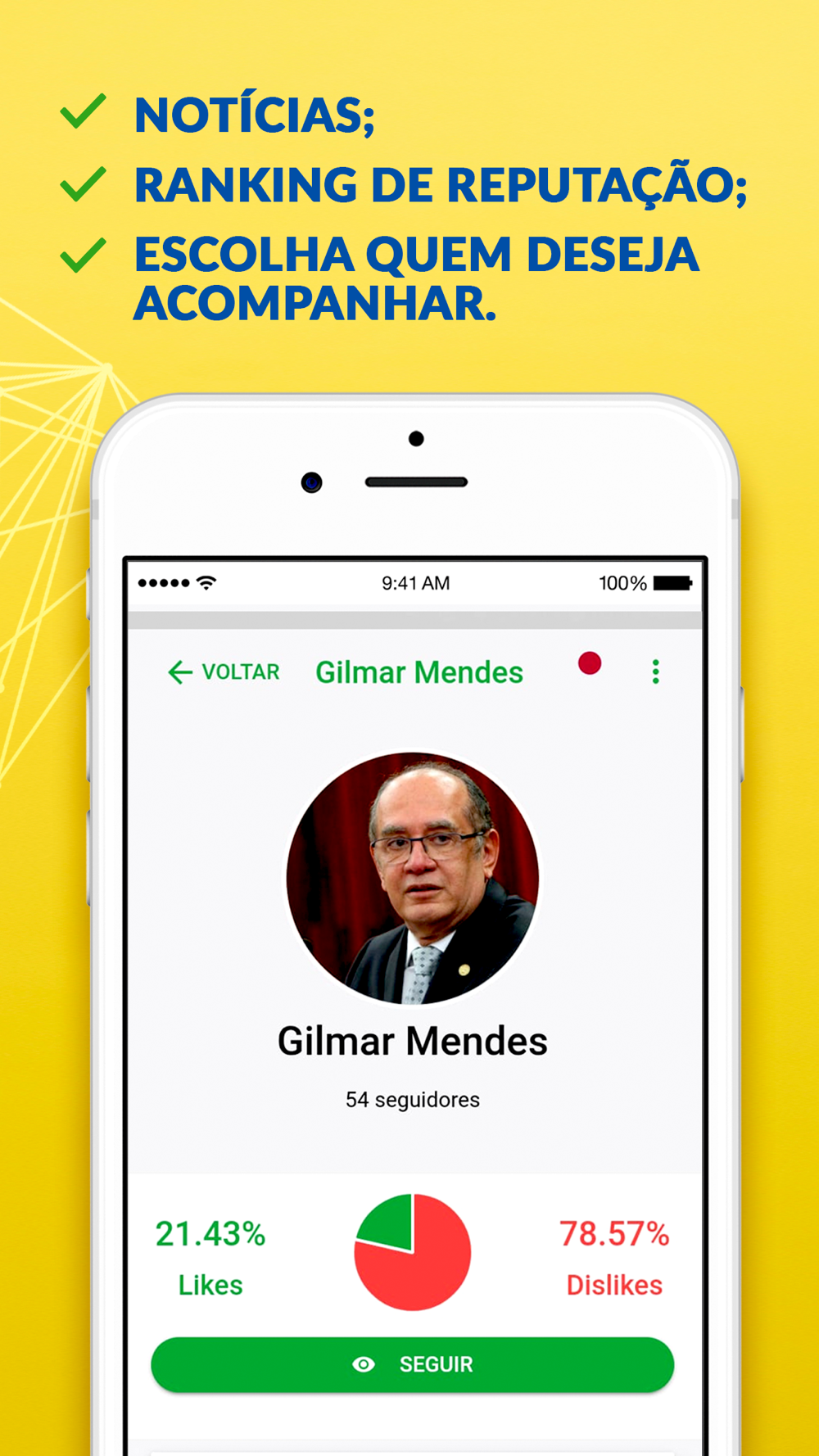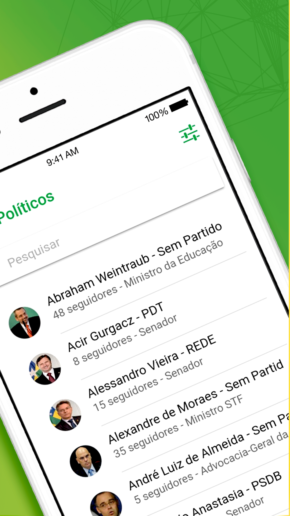 Você pode decidir quais os políticos em mandato deseja acompanhar, e através do nosso sistema de notificações você irá ficar sempre por dentro, de todos os fatos ao redor de seus candidatos escolhidos.
