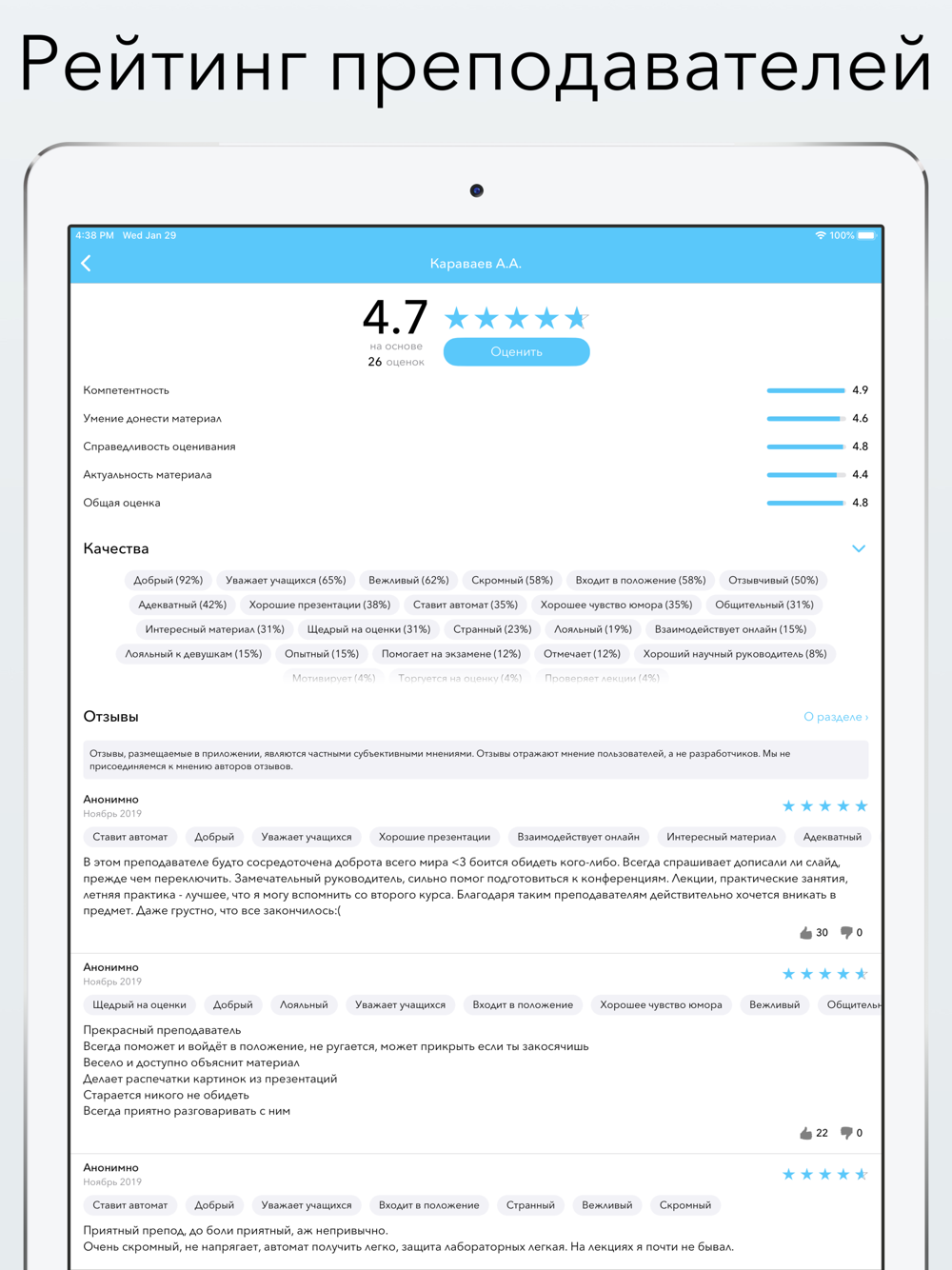 Просматривайте своё расписание в удобном формате, оценивайте преподавателей и пишите отзывы.
