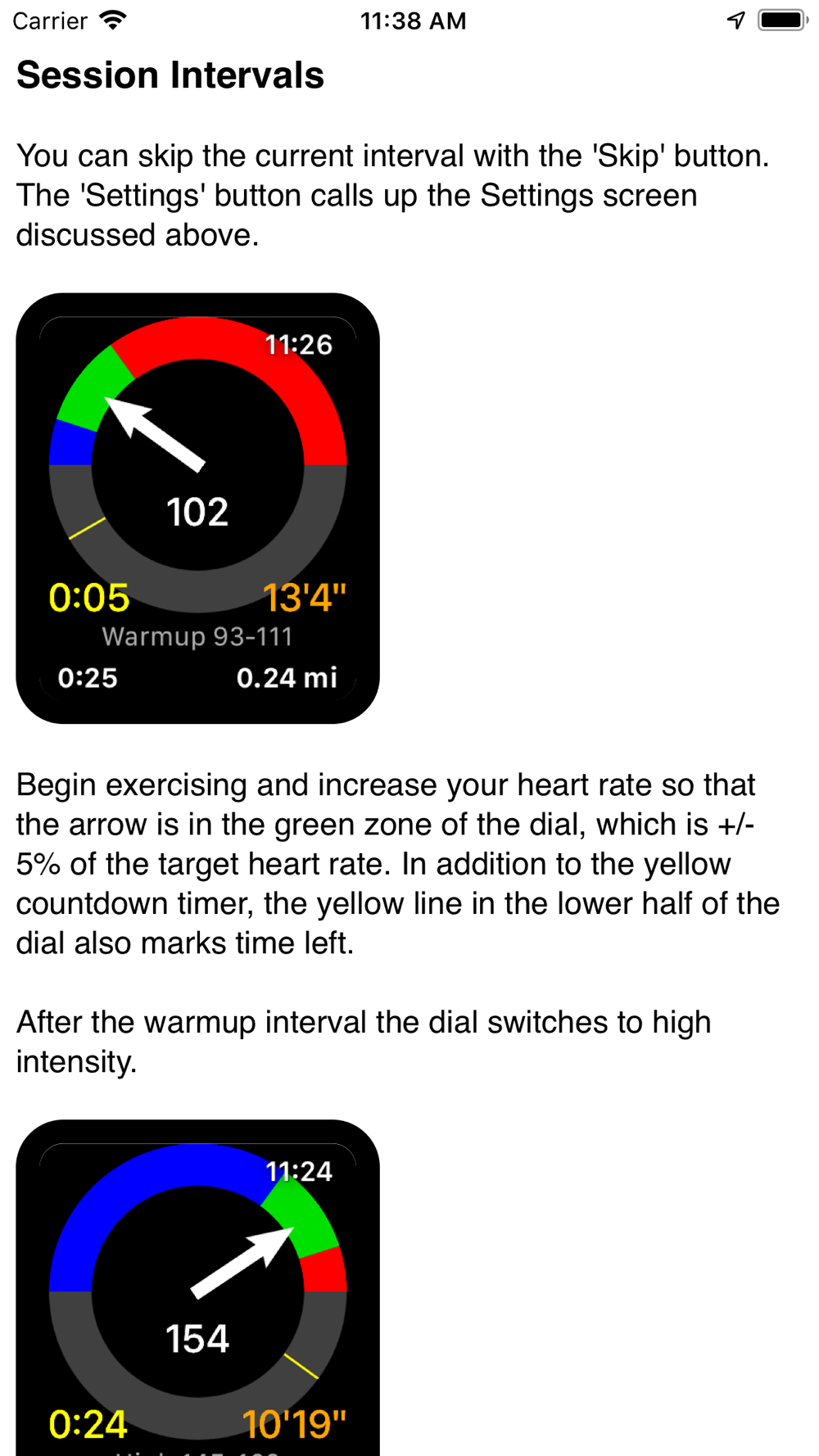 HIIT 4x4 uses a speedometer type dial to display heart rate. When the arrow is in the green zone then your heart rate is within the interval target. If the heart rate later falls out of the target range, warning chimes are issued until back in range.