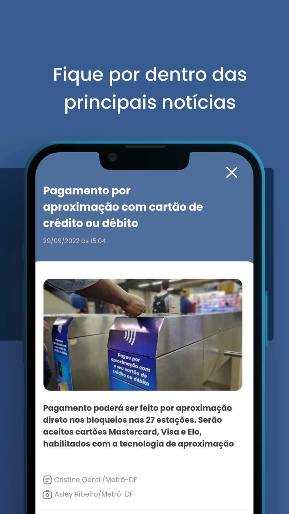 - Receba notificações sobre qualquer evento importante do metrô que possa impactar sua viagem. Agora o Metrô-DF poderá se comunicar diretamente com todos os seus usuários, em caso de necessidade, de forma ágil e eficiente;