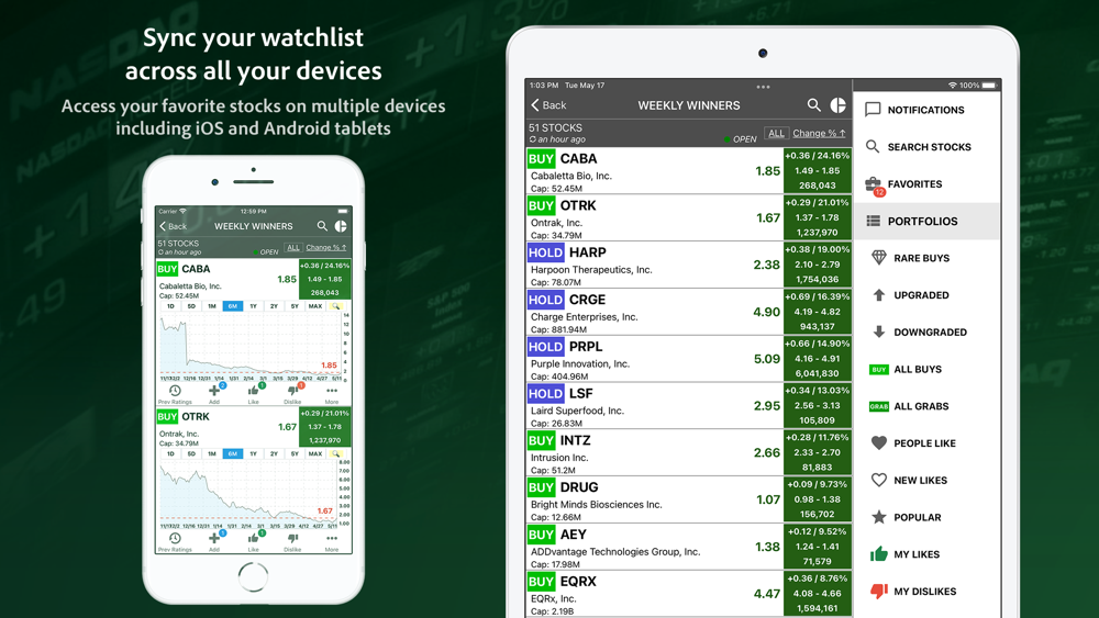 • Add stocks with Buy ratings to your watchlist and sort them by daily gains, trading volume, volatility, etc.