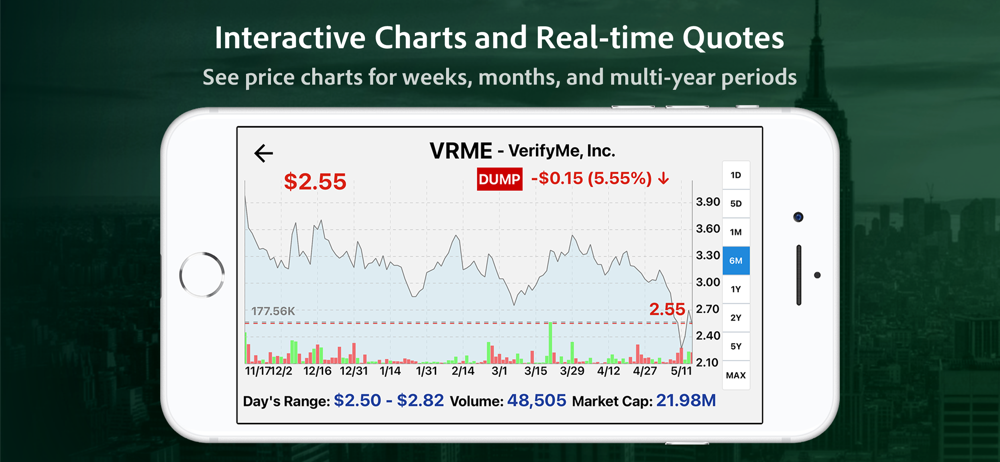 • Tap any ticker in any portfolio to see price charts for weeks, months, and multi-year periods.