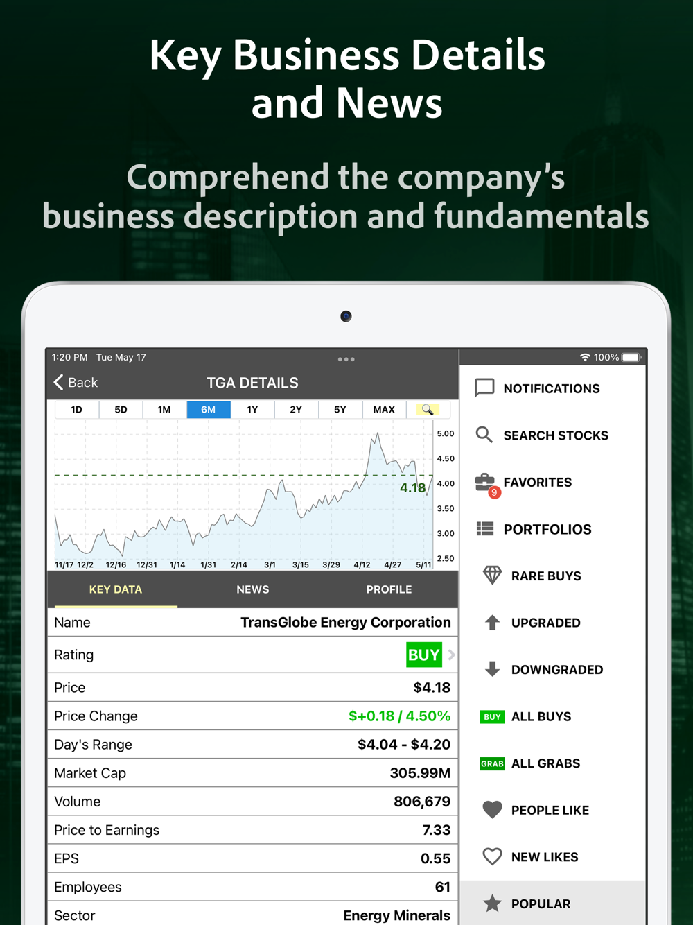 • Touch the profile, metrics, and history tabs to see the company’s business description, fundamentals, etc.
