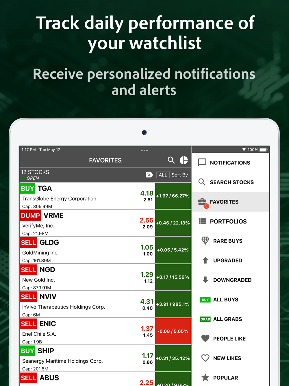• Color-coded sparklines allow you effortlessly track stock performance throughout the day.