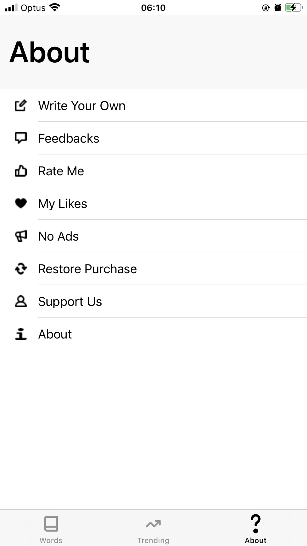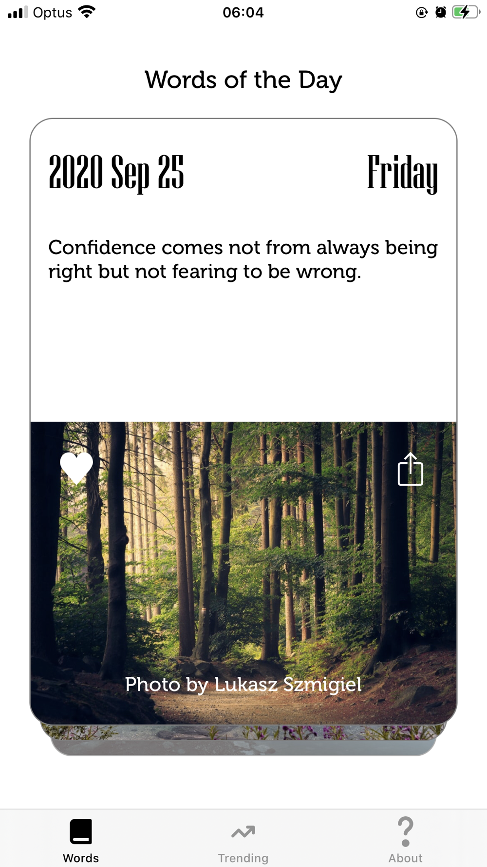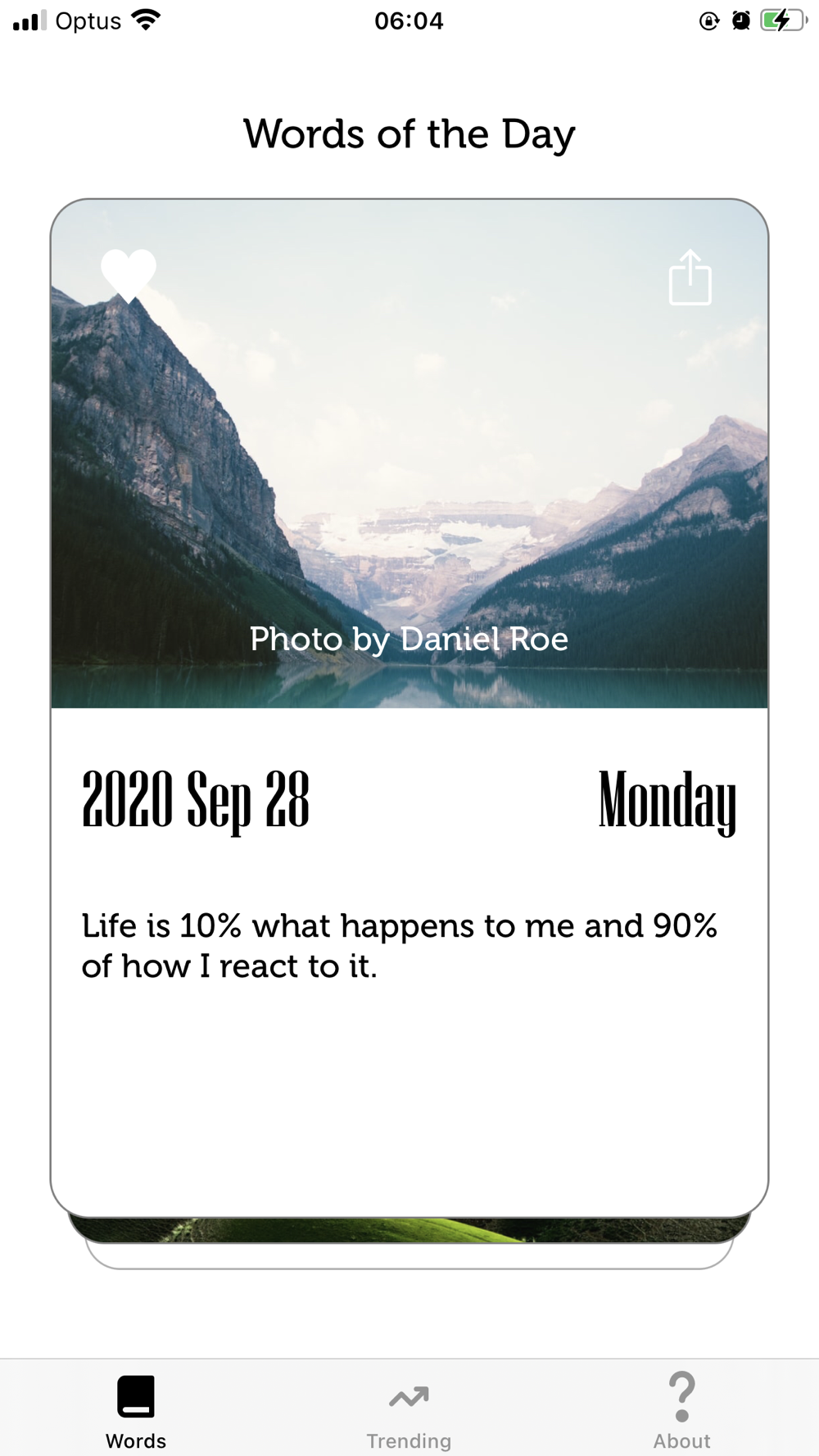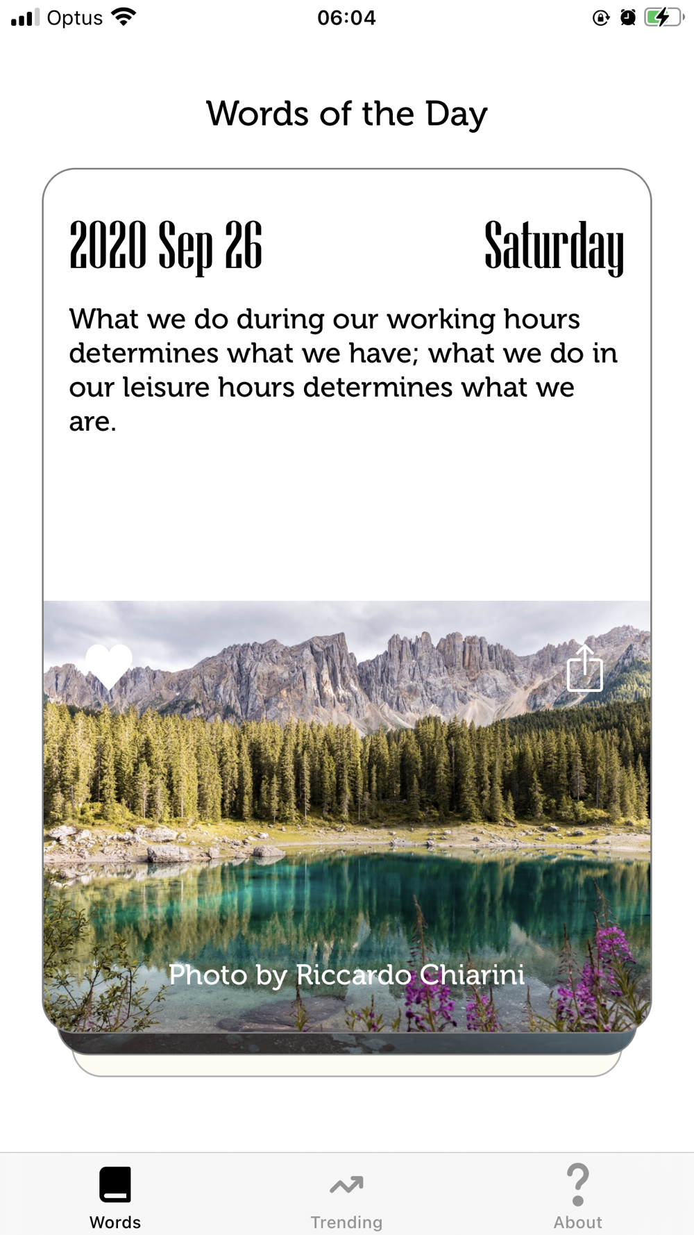 Words of Day offers insightful and inspiring words you can use everyday. Those words are picked and examined by our staff members regularly. You can swipe the card left to dislike it or swipe right to like it.