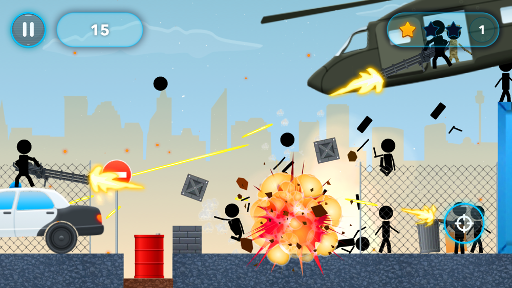 Fight the police and military. Arrange a battle with gangsters who want to rob a bank. Shoot from brutal weapons. Blow up everything around and destroy buildings.Watch how stickmans fly apart. Take part in the stickman war now!