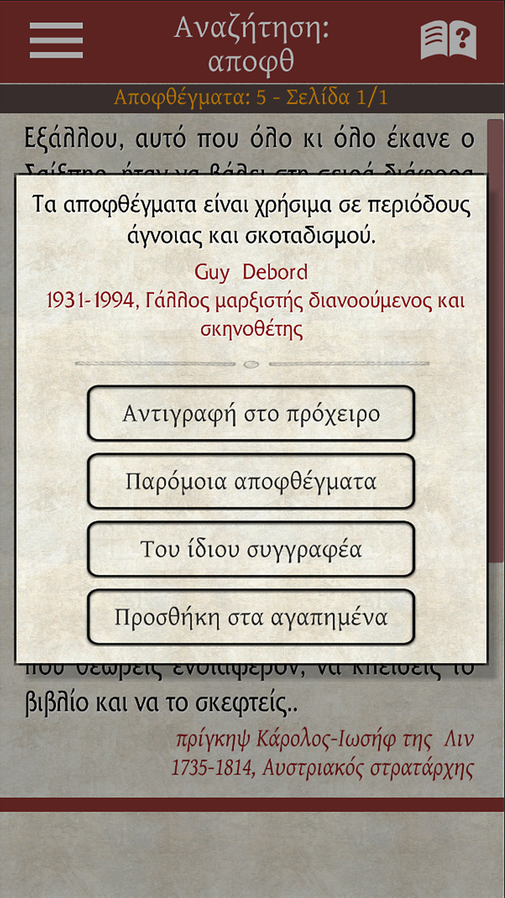 Μπορεί να γίνει επίσης αναζήτηση συγγραφέα και να εμφανιστούν όλα τα αποφθέγματά του.