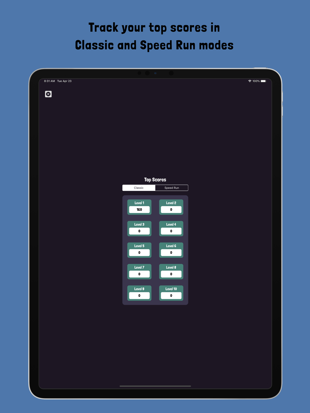 Have a friend join you in a 2 player game. Each player is given an identical sequence of blocks to keep things fair. Clearing 2 or more lines at a time will send penalty lines to your opponent. In Classic Mode the player whose board fills to the top loses. In Speed Run Mode the first player to get to a specified number of cleared lines wins!