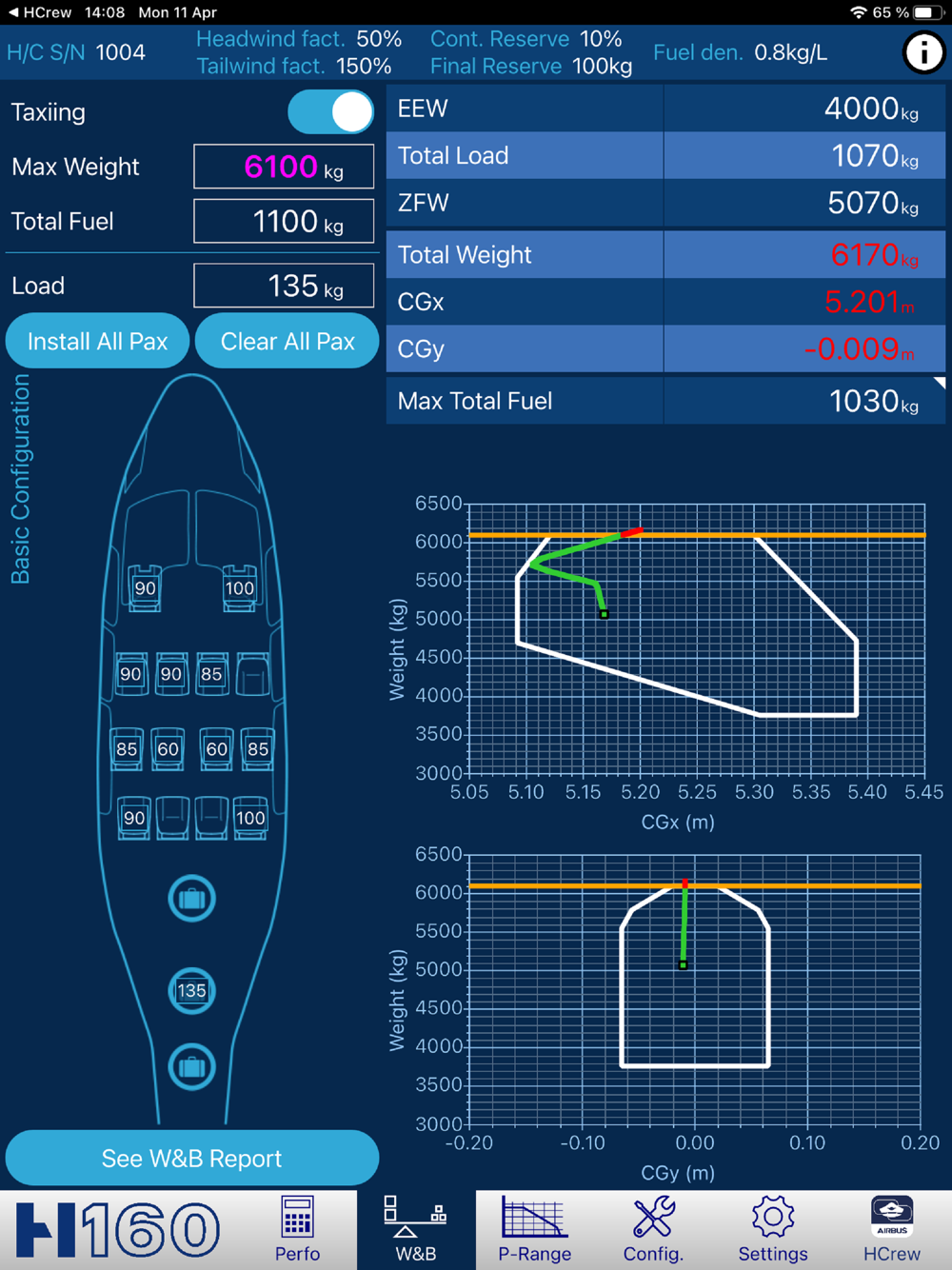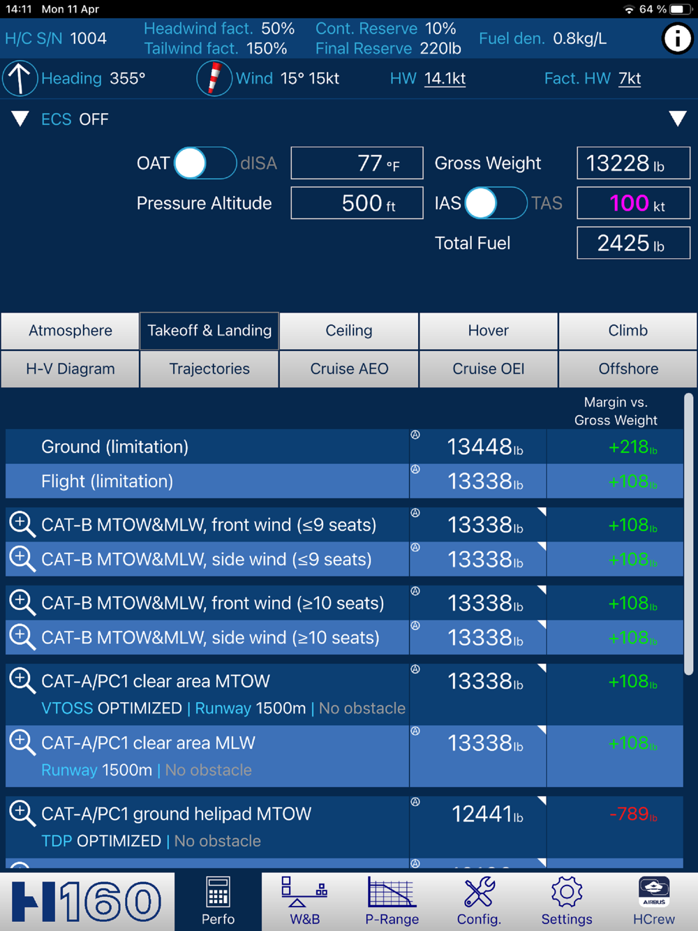 The performance calculation is based on the flight conditions and the helicopter’s configuration as set by the user. The latter is set through the sister app: HCrew.