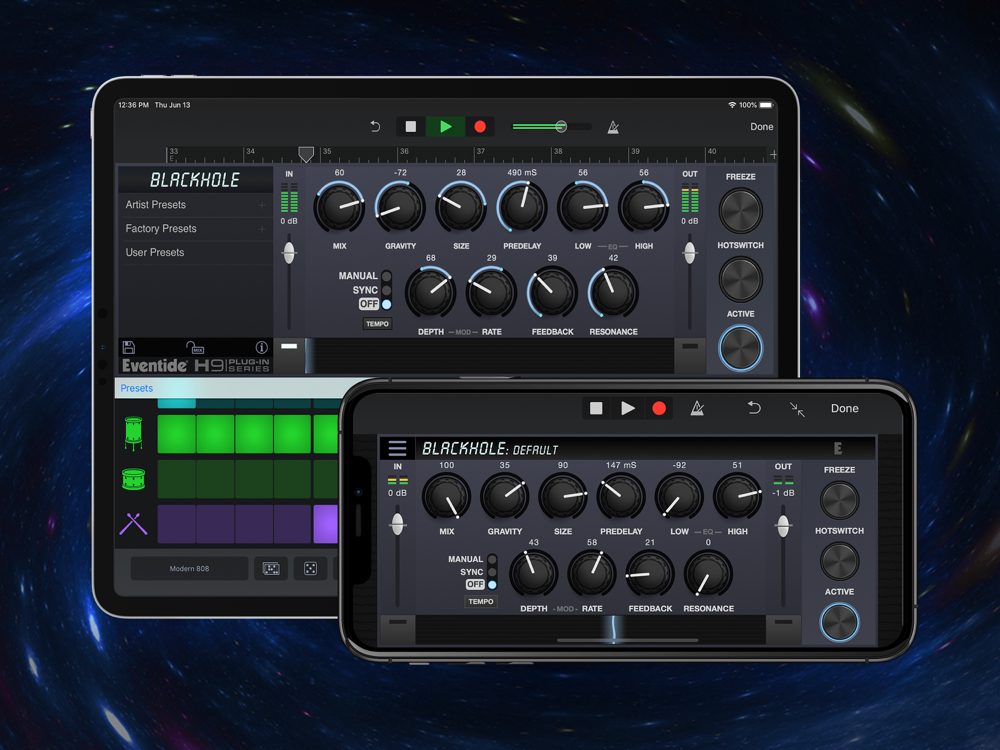 Create out of this world ambiance with Blackhole, a reverb effect as big as the cosmos. Blackhole breaks the rules by allowing you to create virtual spaces that could never exist in reality. At large sizes, its soft attack and lingering, harmonic tails allow it to really shine on guitars, strings, vocals and pads. At small sizes those very same qualities can add an angelic sheen to vocals or turn a simple drum track into an otherworldly rhythm section.