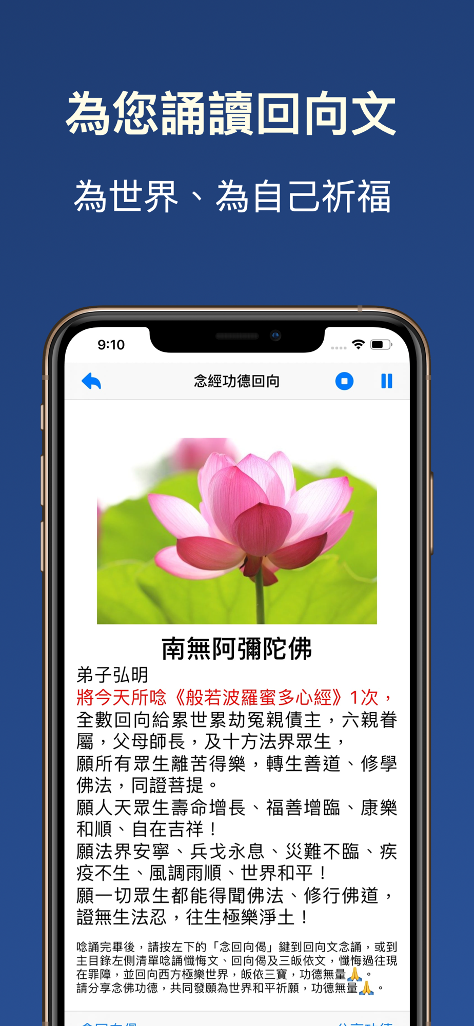 提供背景播放功能,「粵語心經」程式可以在您關閉屏幕下繼續念誦咒文而不會中斷。