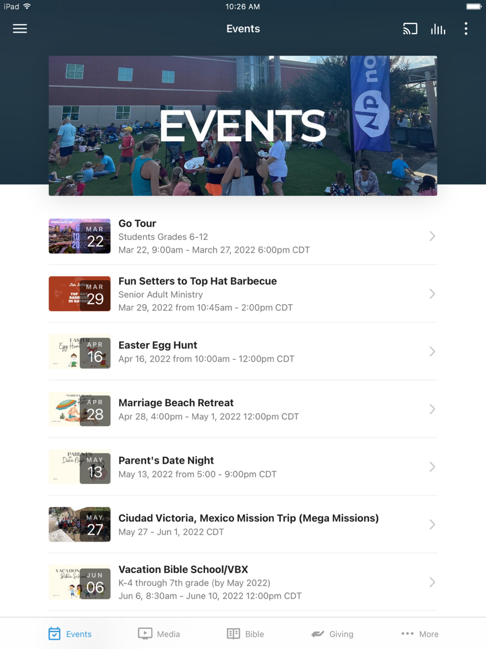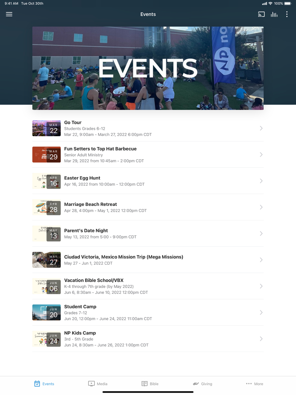 This app will help you stay connected with the day-to-day life of our church. With this app you can watch or listen to past messages, stay up to date with push notifications, share your favorite messages via Twitter, Facebook, or email, and download messages for offline listening. You can also register for events, follow along on our bible reading plan, and give tithes and offerings. We hope this app helps you stay connected to everything happening at NorthPark!