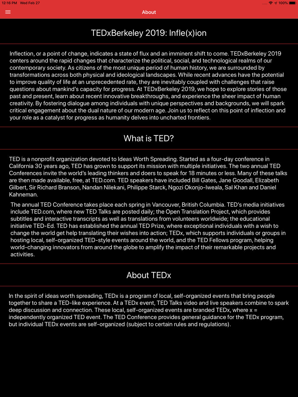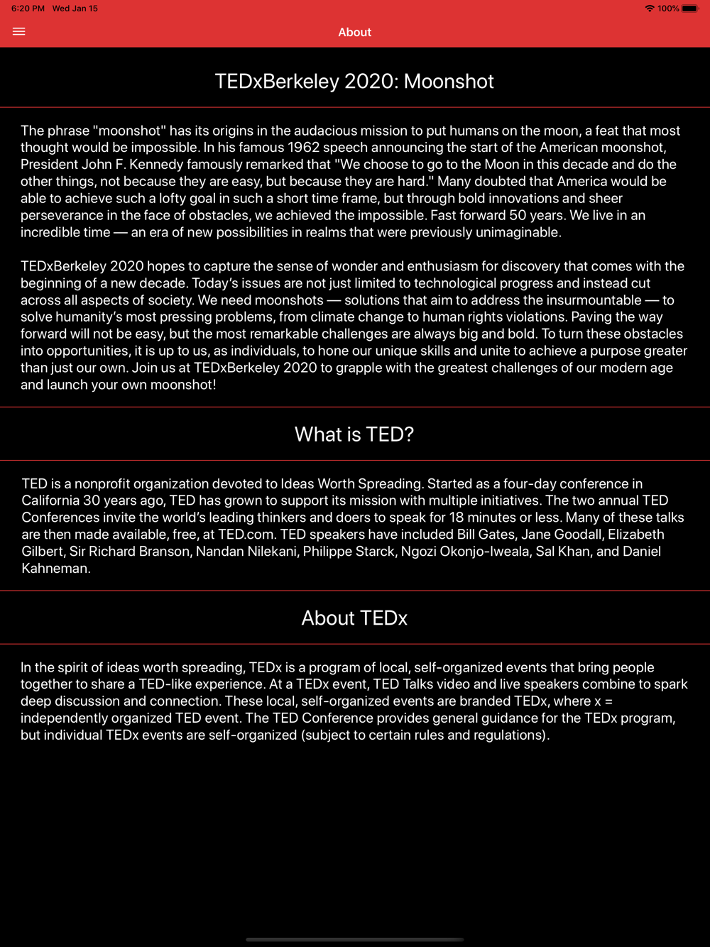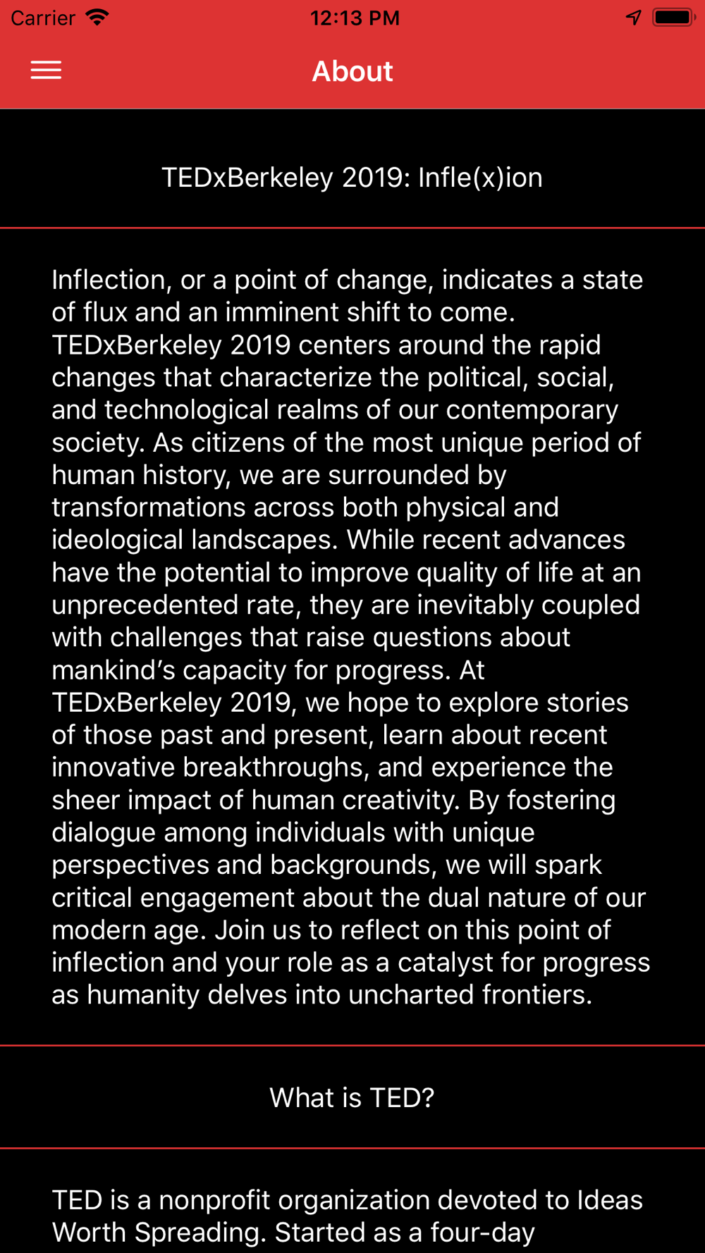 Nestled between the San Francisco Bay and lush Northern California foothills, Berkeley is home to the world’s premier public university as well as a vibrant, diverse population that is renowned for its social activism and entrepreneurship. TEDxBerkeley, an award-winning TED-based nonprofit, seeks to capture the spirit of Berkeley by gathering visionary thinkers and leaders from the Bay Area and beyond to spark new ideas, insights, and opportunities. TEDxBerkeley hopes to engage its eclectic audience by featuring unique talks that are intellectually bold, passionate, and unafraid to question and redefine the status quo.