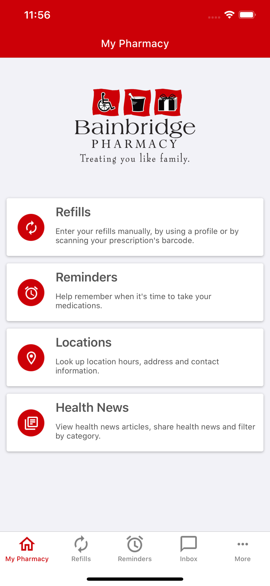 The Bainbridge Pharmacy app allows you and your family to securely communicate with your local pharmacy. Refill your prescriptions with one click, get refill reminders, get discounts at your local pharmacy, get savings on brand drugs and access Pharmacist written pages that help you understand your condition or medications.