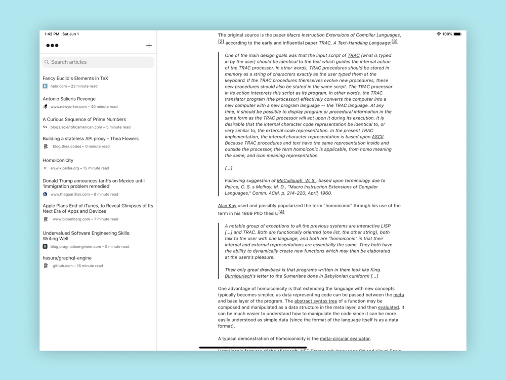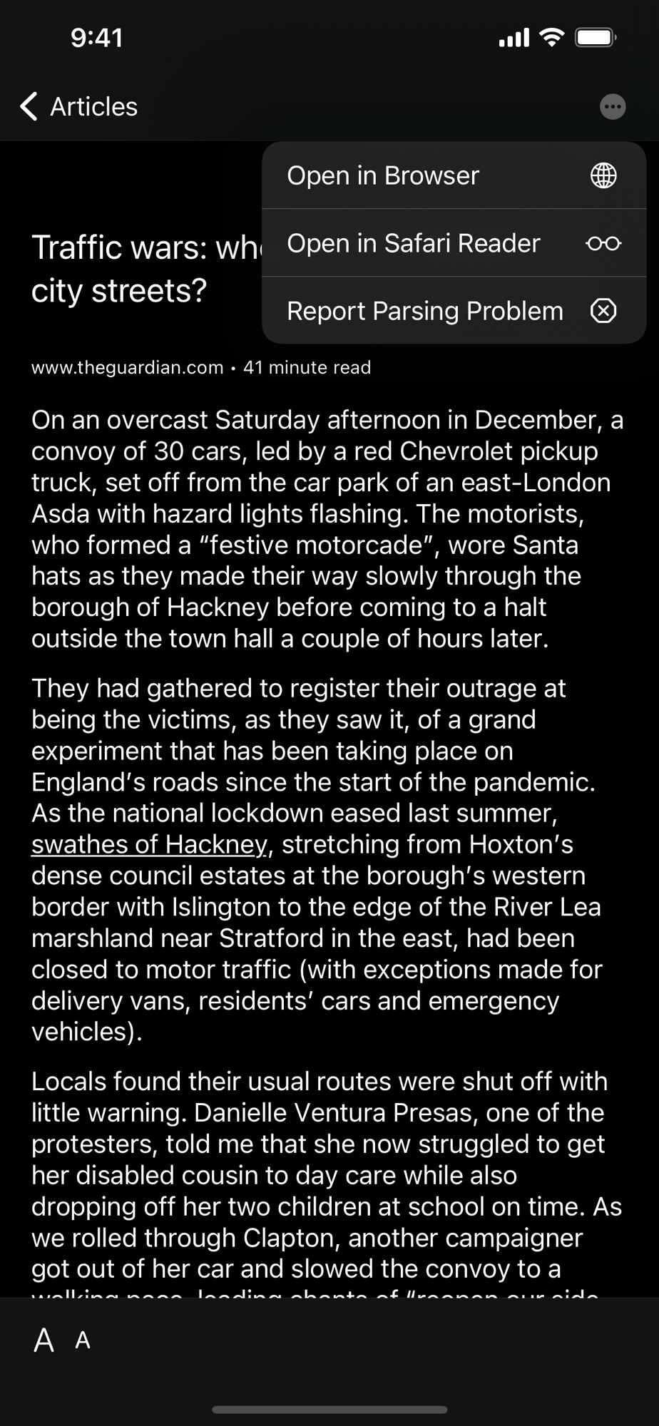 - Device-based Parsing: Articles are swiftly parsed on your device, ensuring your reading is both private and fast. Stored directly in your iCloud account, access them anytime, even offline.