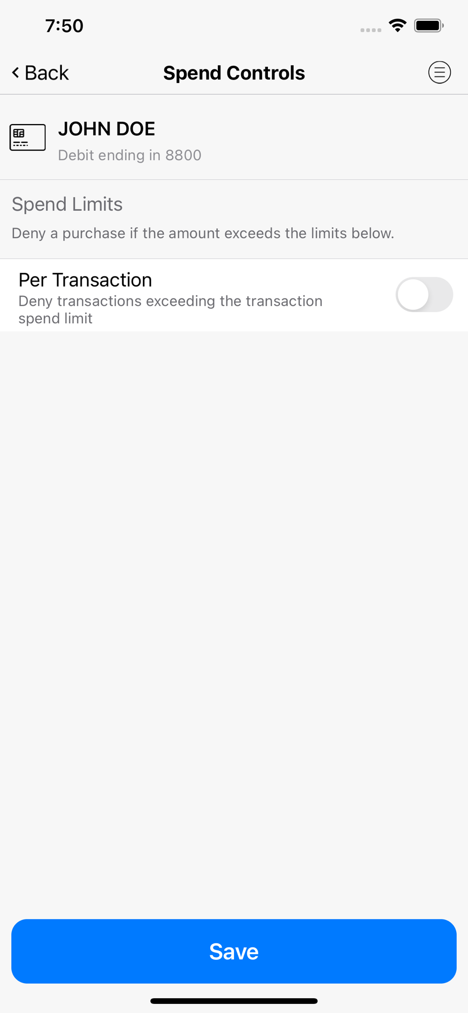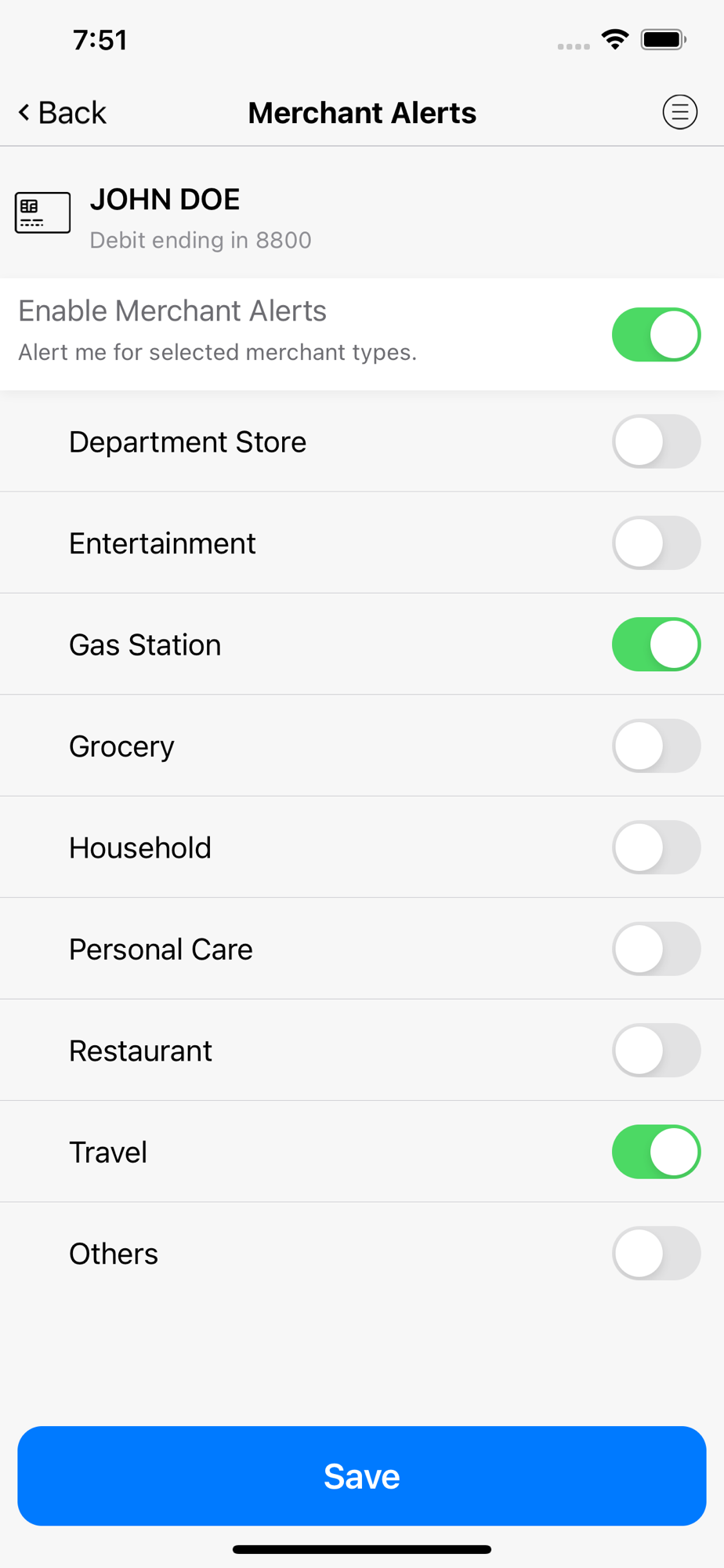 Usage Controls and Alerts Set spending limits to decline transactions above your thresholds. Monitor activity by category such as gas stations and restaurants, and by type: in-store purchases, e-commerce transactions, and ATM transactions.
