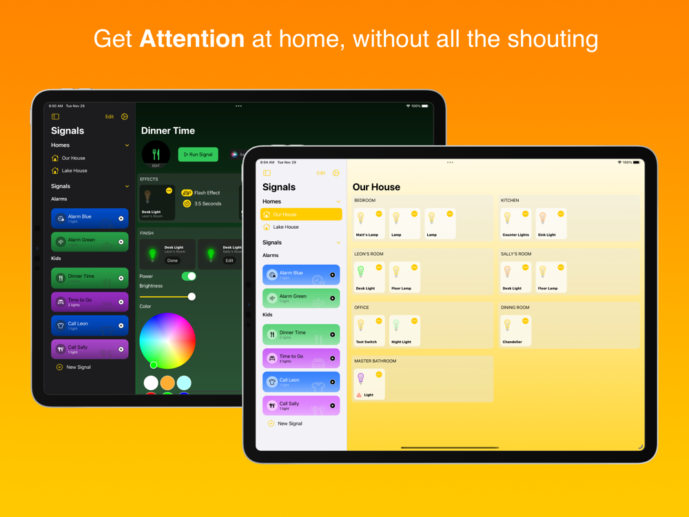 Signals works with any of your bulbs, switches or outlets with lights attached - have a kid who plays video games with headphones on? Just tap on their light to give it a few flashes.