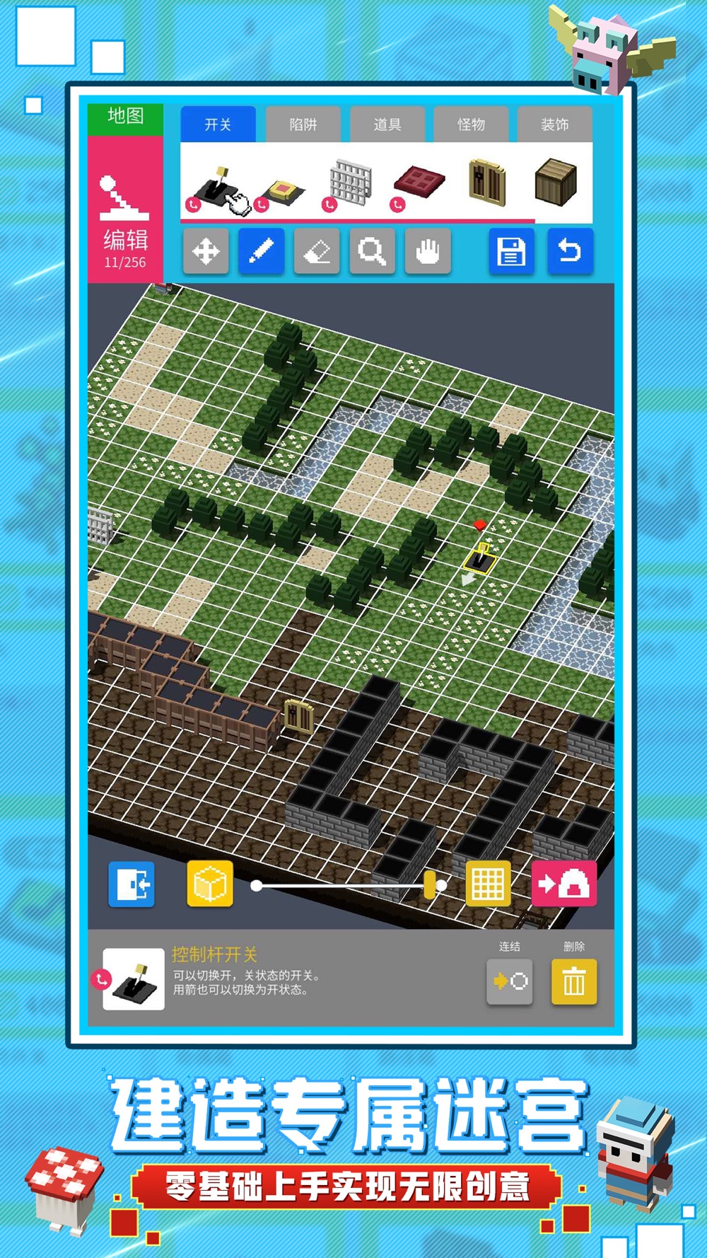 《砖块迷宫建造者》是一款沙盒类解密冒险游戏。玩家可以通过对海量的组件、地形和机关的自由组合,使用迷宫编辑器,像堆积木一样轻松设计出独特风格的迷宫,并自由分享和交流。也可以作为闯关者,利用丰富的道具挑战和解谜别人的迷宫,体验不同的关卡趣味。