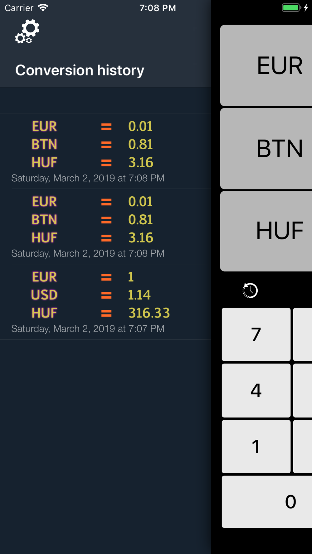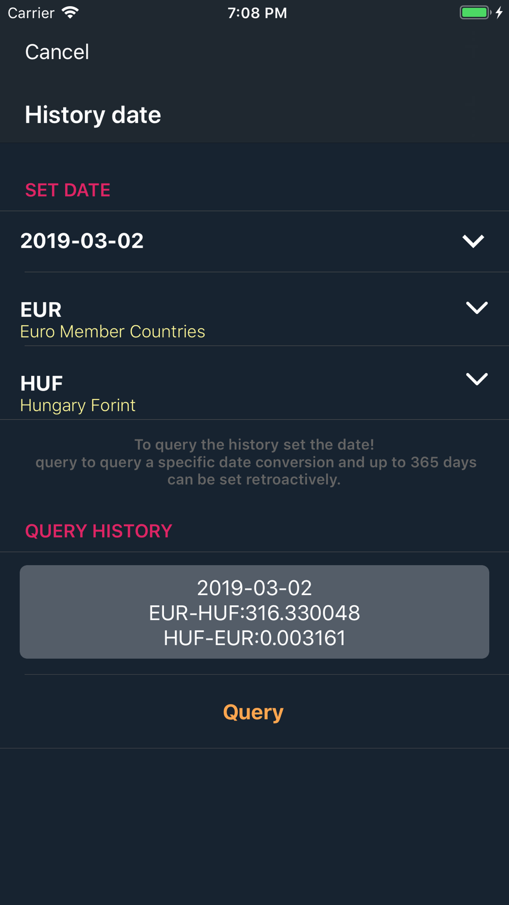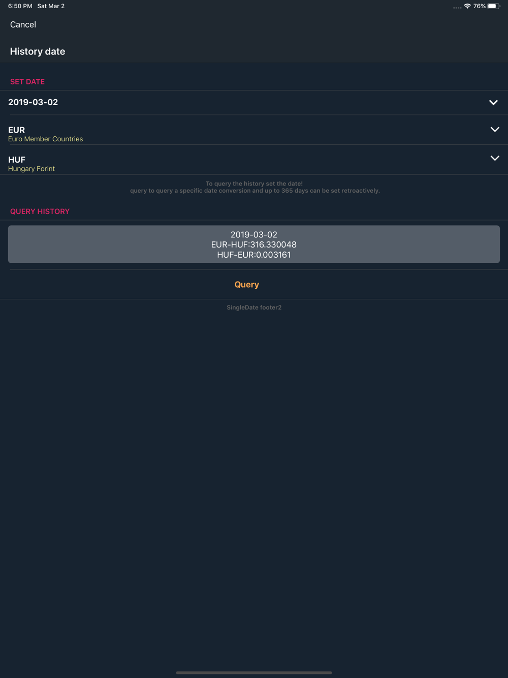 You can query a few conversions for a selected date period, the value of the exchange rate that can be retrospectively reached for 365 days. After the query result is displayed, the exchange rate (beta currently) is displayed graphically by rotating the device to the right. Retrieving Advances is subscription-based.