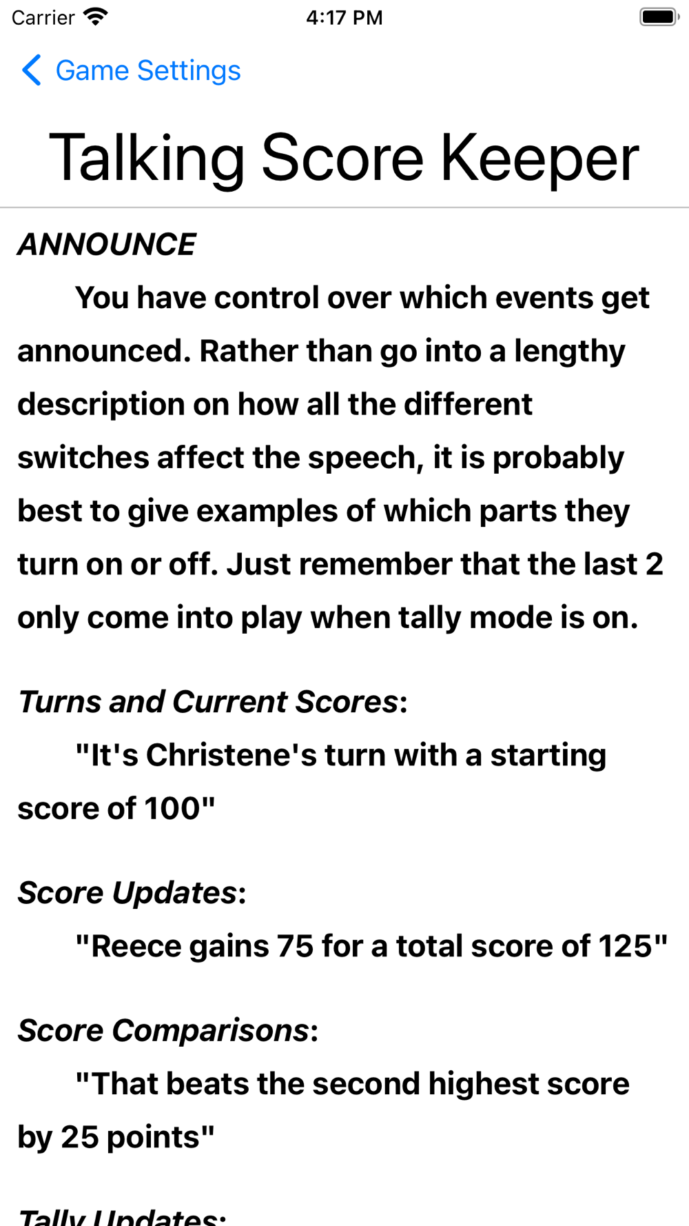Well, say hello to Talking Score Keeper - or maybe it should say hello to you! It's the only app that announces who's turn it is, their score, how much they need to get to be in first place and much more. It's all customizable in an easy, intuitive interface.