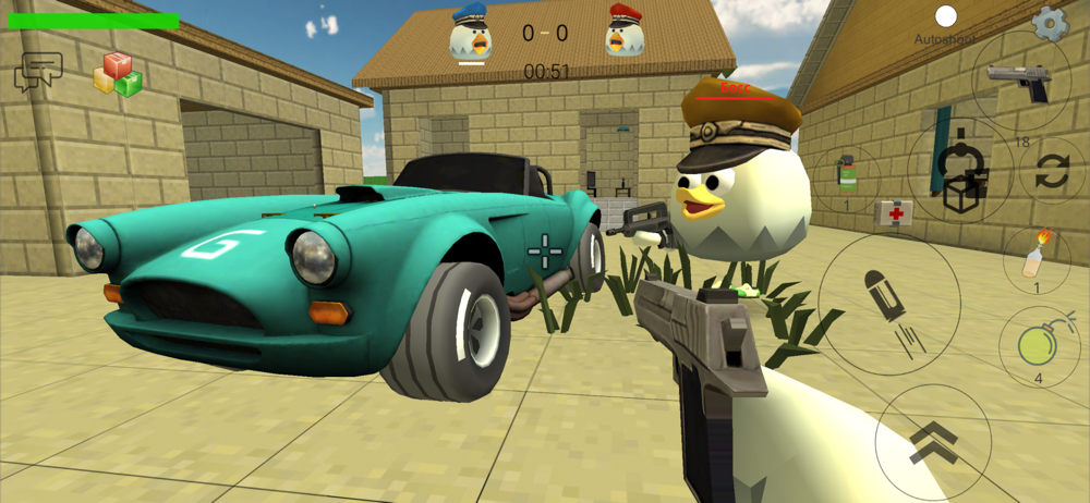 Armed chickens shoot and fight with each other. Shooting on the network with two modes, 5 vs 5 and against all. You can cool your chicken, weapon, beak, sneakers and caps. This is a cockfight. Throw explosive eggs and arrange a slaughter. Join to angry roosters firefight.