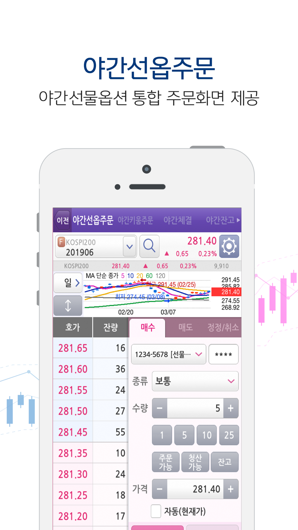 국내선물옵션과 야간선물옵션을 하나의 앱으로 구현하여 빠르고 강력한 트레이딩 환경에서 거래할 수 있습니다.