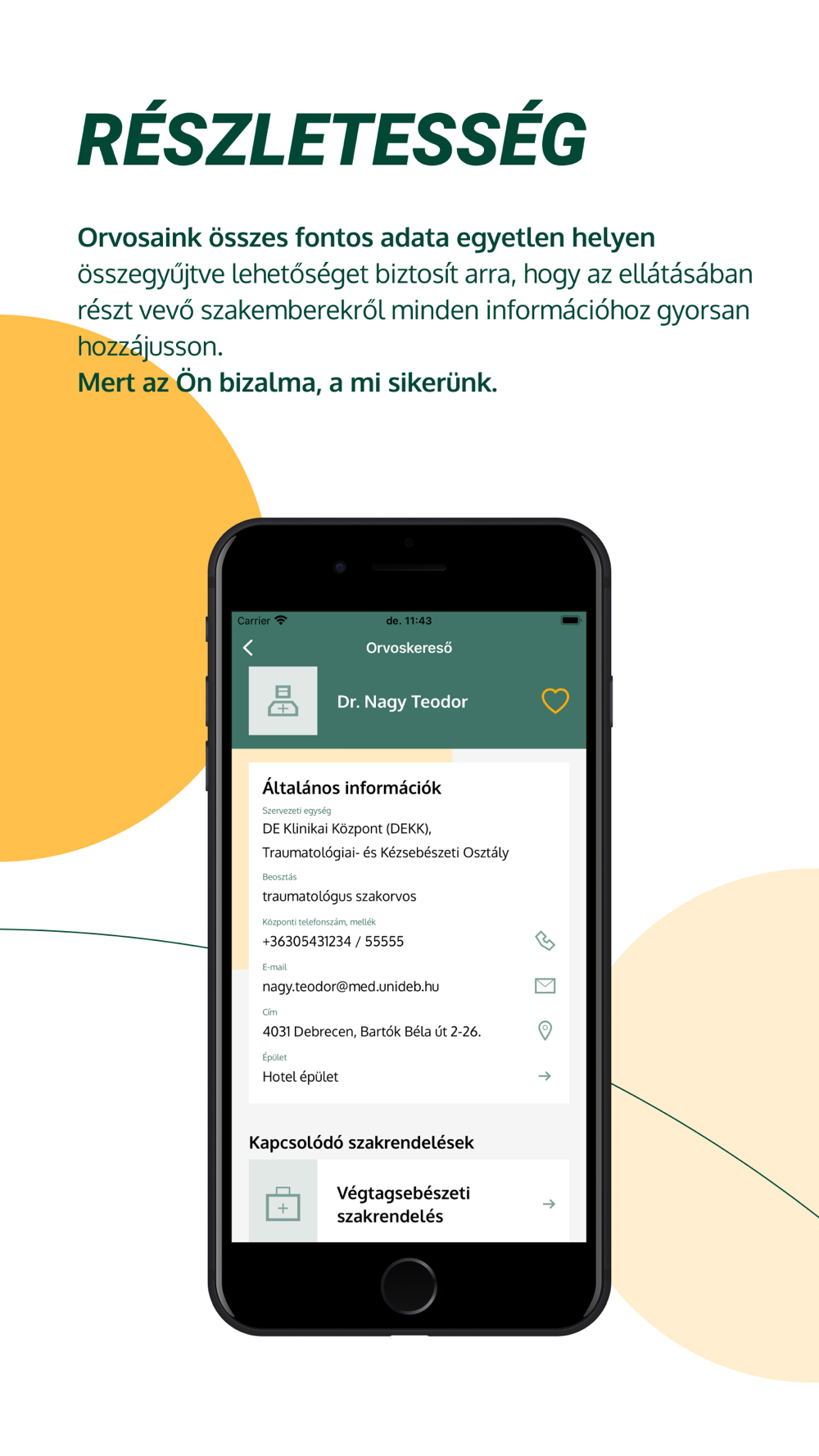 Orvoskereső alkalmazásunk az egyetem betegellátási tevékenységében részt vevő orvosok gyors elérését támogatja. A szakrendeléskereső alkalmazás segítségével a felhasználók az egyetem által nyújtott rendelésekkel kapcsolatban juthatnak hozzá hasznos információkhoz, legyen szó rendelési időről, az azt végző orvosról, vagy az ellátás helyszínéről. Ez utóbbi az ún. helyszínkereső fejlesztésünk segítségével valósulhat meg, ez az alkalmazás szabad szavak vagy kategóriák szerint nyújt lehetőséget térképen való keresésre, kiegészítve navigáció-, hívásindítás támogatással és még sok mással. Az alkalmazás offline is működik, ez még inkább megkönnyíti a sikeres tájékozódást a Központ területén.