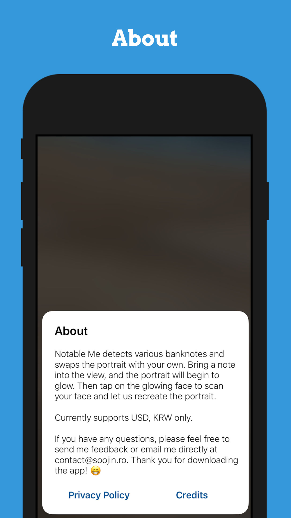 Notable Me is an entertaining, eye-catching AR app that let you recreate a bill with your portrait drawn on instead of the famous historic figures. Experience how it feels to have become a notable person!