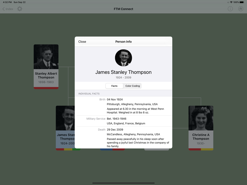 Family Tree Maker Connect (FTM Connect) is a companion app to Family Tree Maker desktop genealogy software that enables the user to view their family tree on their iOS device.