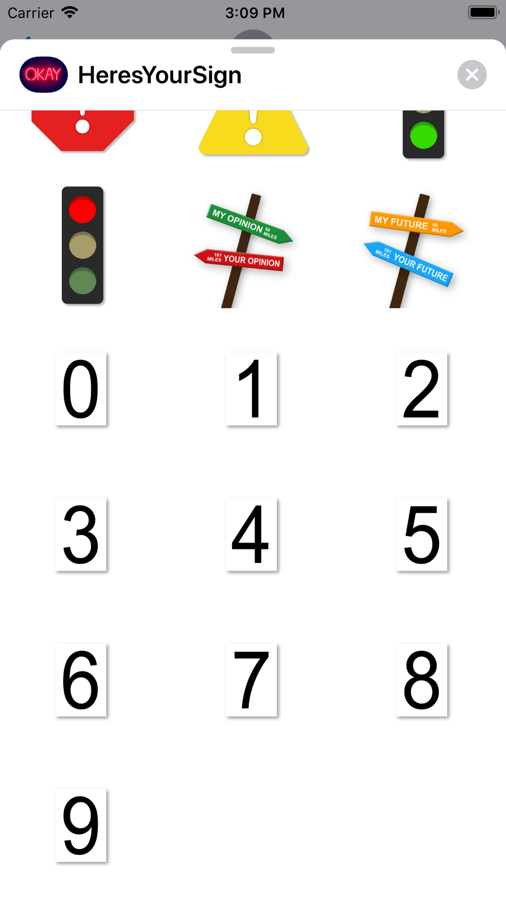 This sticker pack includes animations such as a blinking neon OKAY sign, 0 to 60 in 2.5 seconds, a rotating toxic sign, and traffic lights that go from green to red and from red to green. There are also static images ranging from traffic signs, to mailbox number stickers, to directional mile counters, sale notices, and Xcode warning icons.