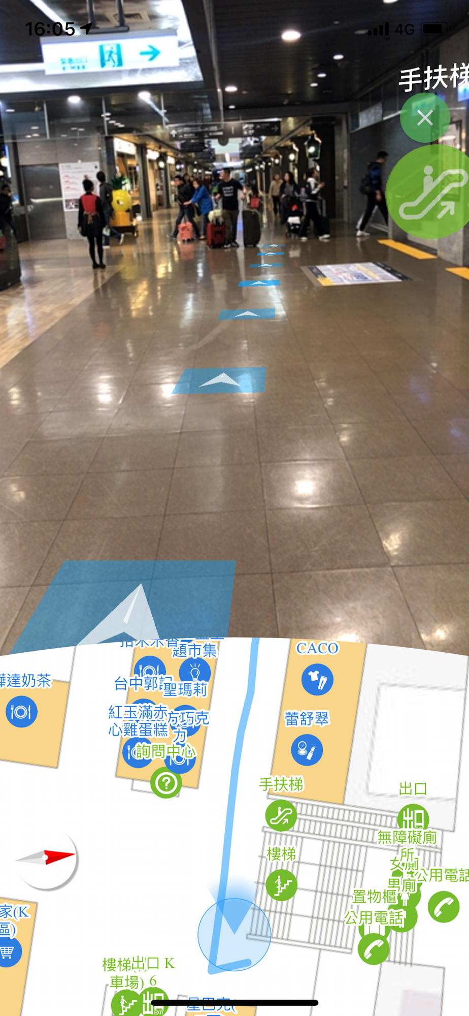 場域內,打開「臺灣車站行」APP,使用者只要輸入想去的地方,就能體驗眼見為憑的直覺式導引,順著螢幕上「虛擬箭頭」所指示的路線前行,很快就能走到目標位置。此系統目前還能搭配中文語音導引, 服務更貼心。