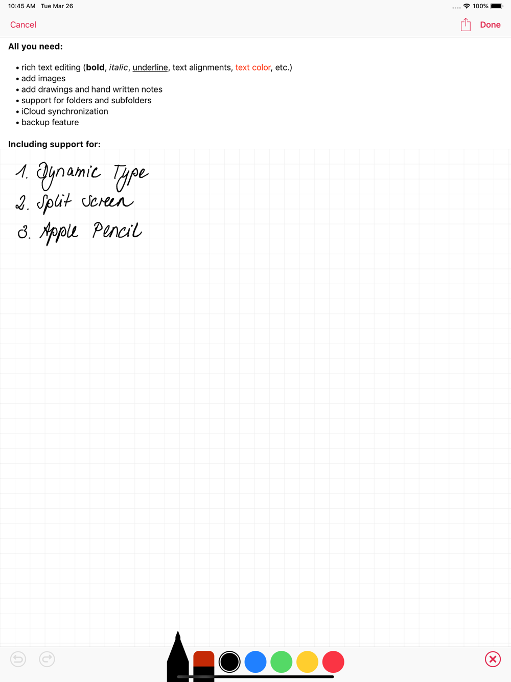 - rich text editing (bold, italic, underline, text alignments, text color, etc.)