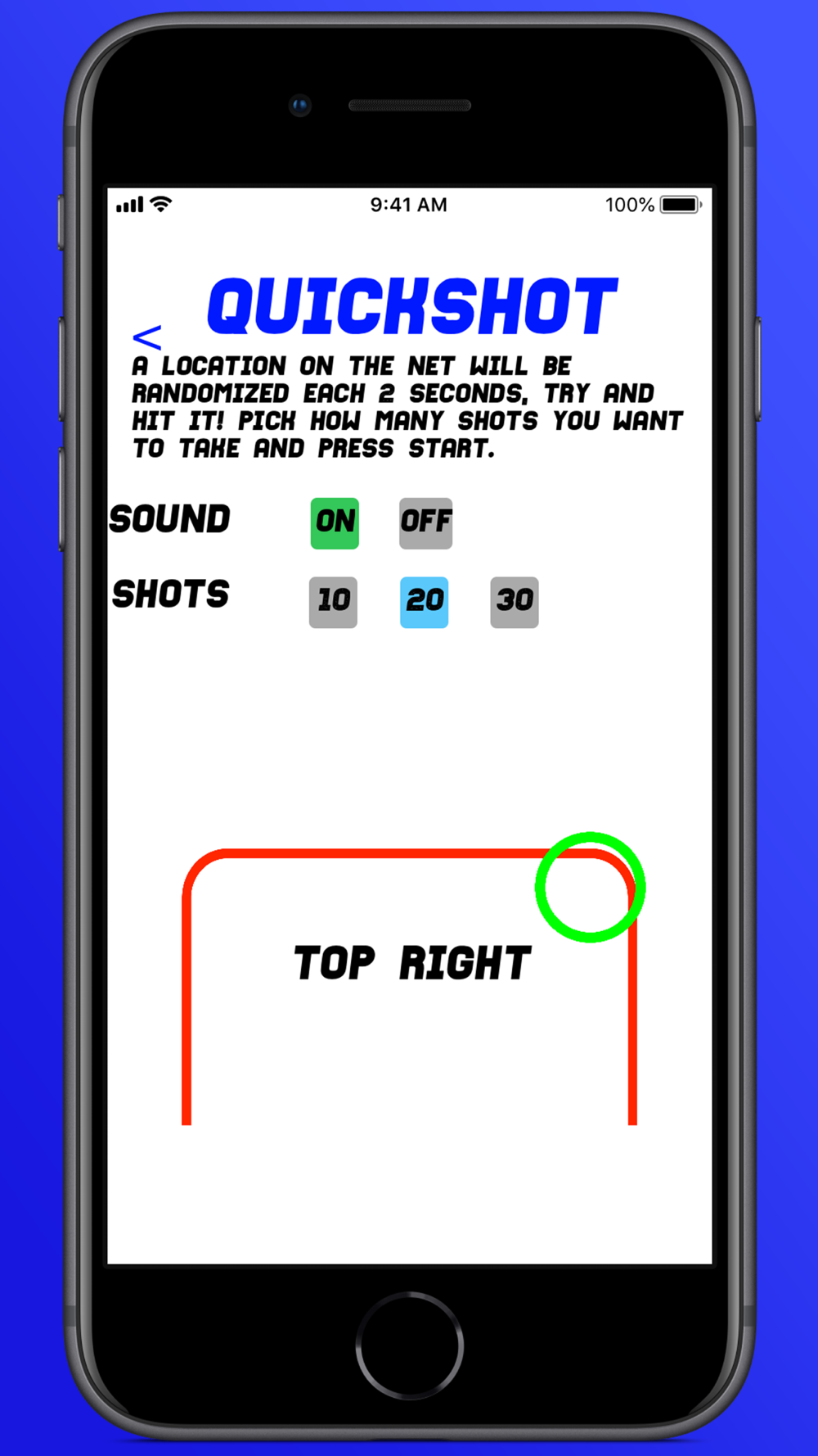 Practice your quick release and work on your accuracy at the same time using the new QuickShot mode! QuickShot picks a random spot on the net every two seconds, all you have to do is get some pucks ready and pick how many shots you want to take. A spot on the net will be shown on your screen and then you can test your accuracy out!