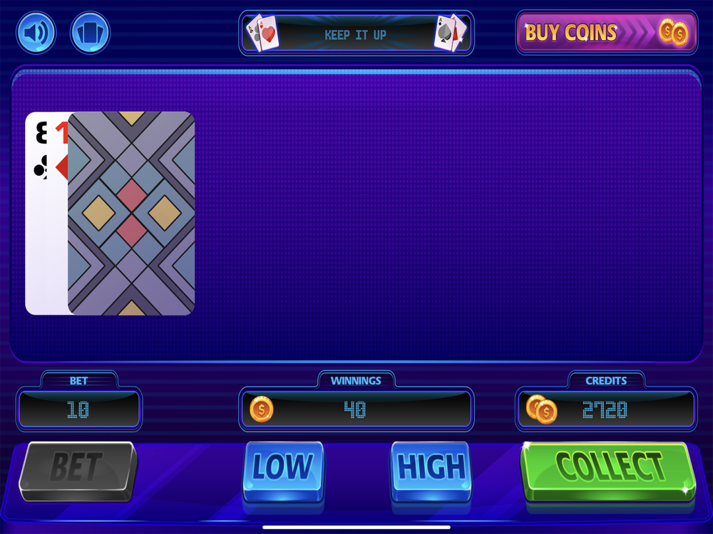 6, You can decide to just collect your winnings but why not double up? You can guess if the next card will be "low" or "high". If you guess right your winning will be doubled and you can guess again (or chicken out and collect your winnings)