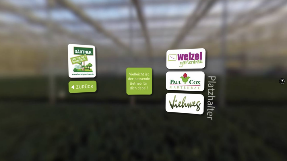 Virtual Reality macht den Beruf Gärtner erlebbar: Mit der Beruf Gärtner App tauchst Du ab in den spannenden Berufsalltag eines Gärtners. Ernte Tomaten als Gemüsegärtner, versetzte Bäume mit schweren Maschinen als Baumschulgärtner, kultiviere vielfältige Staudenpflanzen bis zur Verkaufsreife als Staudengärtner, bepflanze ein Grab als Friedhofsgärtner, schütze Apfelbäume vor Schädlingen als Obstgärtner oder lasse junge Pflanzen erblühen als Zierpflanzengärtner und wenn Du doch lieber im Verkauf arbeiten möchtest, dann ist dies selbstverständlich auch möglich. Beruf Gärtner ein vielfältiger Beruf – werde ein Teil davon!
