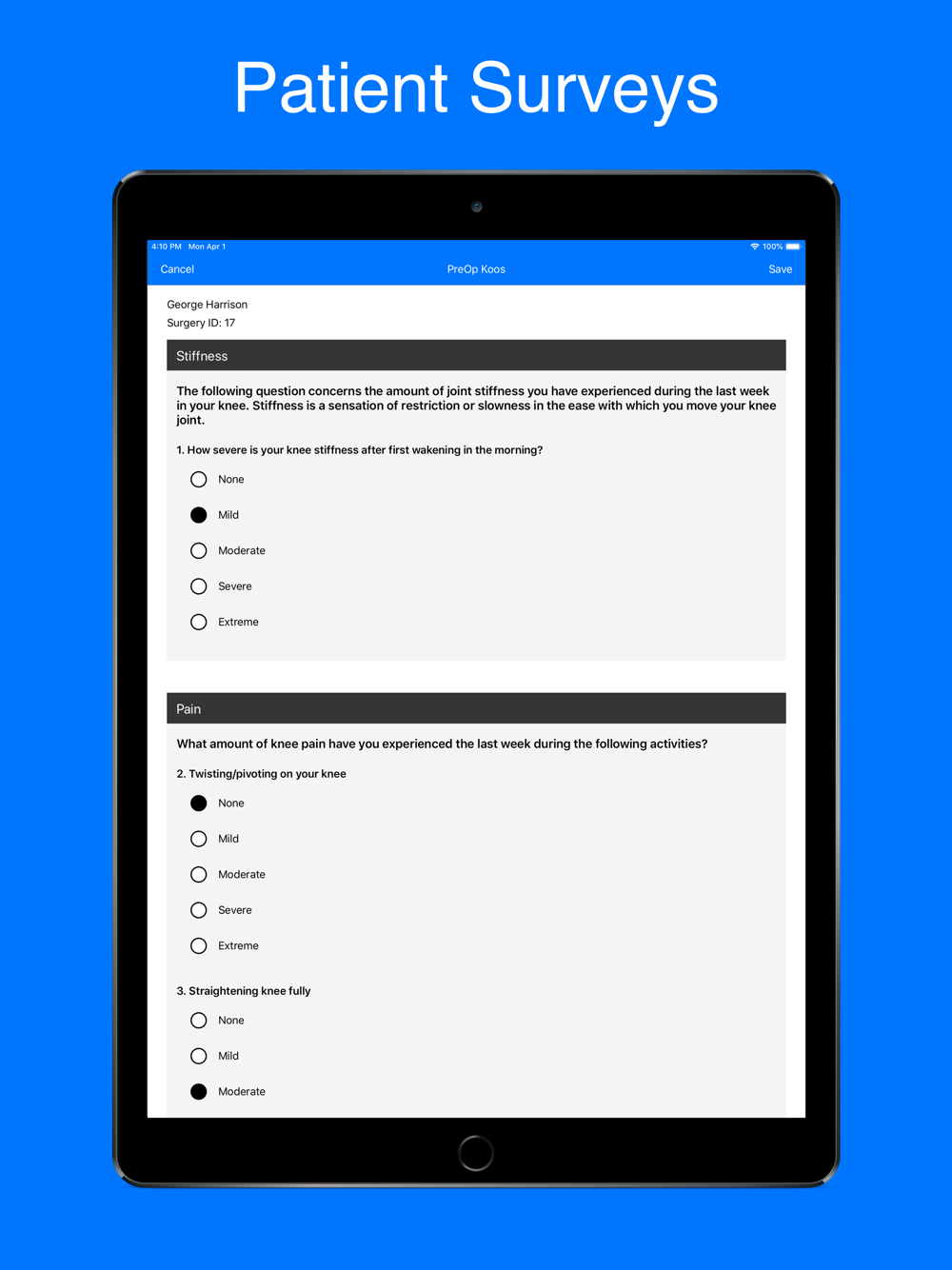 iPRO for Orthopedics is a Mobile Total Joint Registry designed by physicians for physicians. We created an easy to use application that allows providers to track patient outcomes right from their phones. We decided on a minimalistic approach to collect the most meaningful data points while at the same time providing the flexibility to customize the application to meet your needs. This application can be used in a variety of settings including outpatient surgery centers as well as on mission trips. We allow for a team approach which means as a physician you can have your staff help you collect data on your patients and all of your devices will sync through the cloud. We also provide a tablet interface that allows for patients to fill out patient reported outcome surveys. If you are interested in tracking outcomes to improve your patient care then this is the application for you.