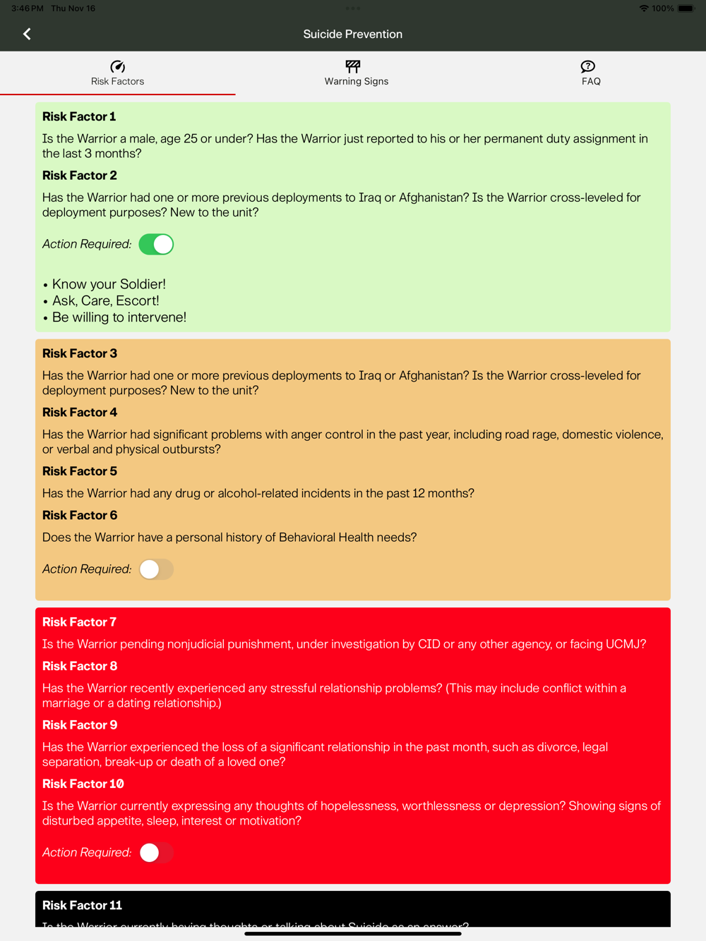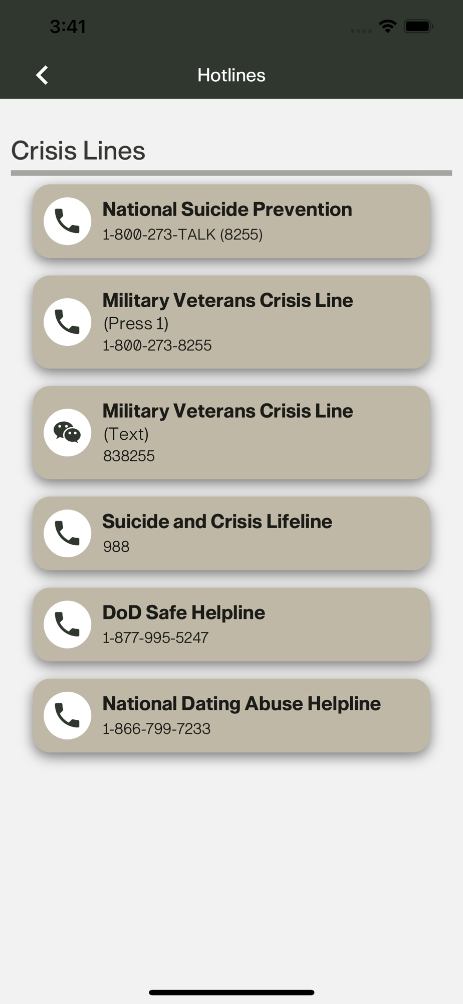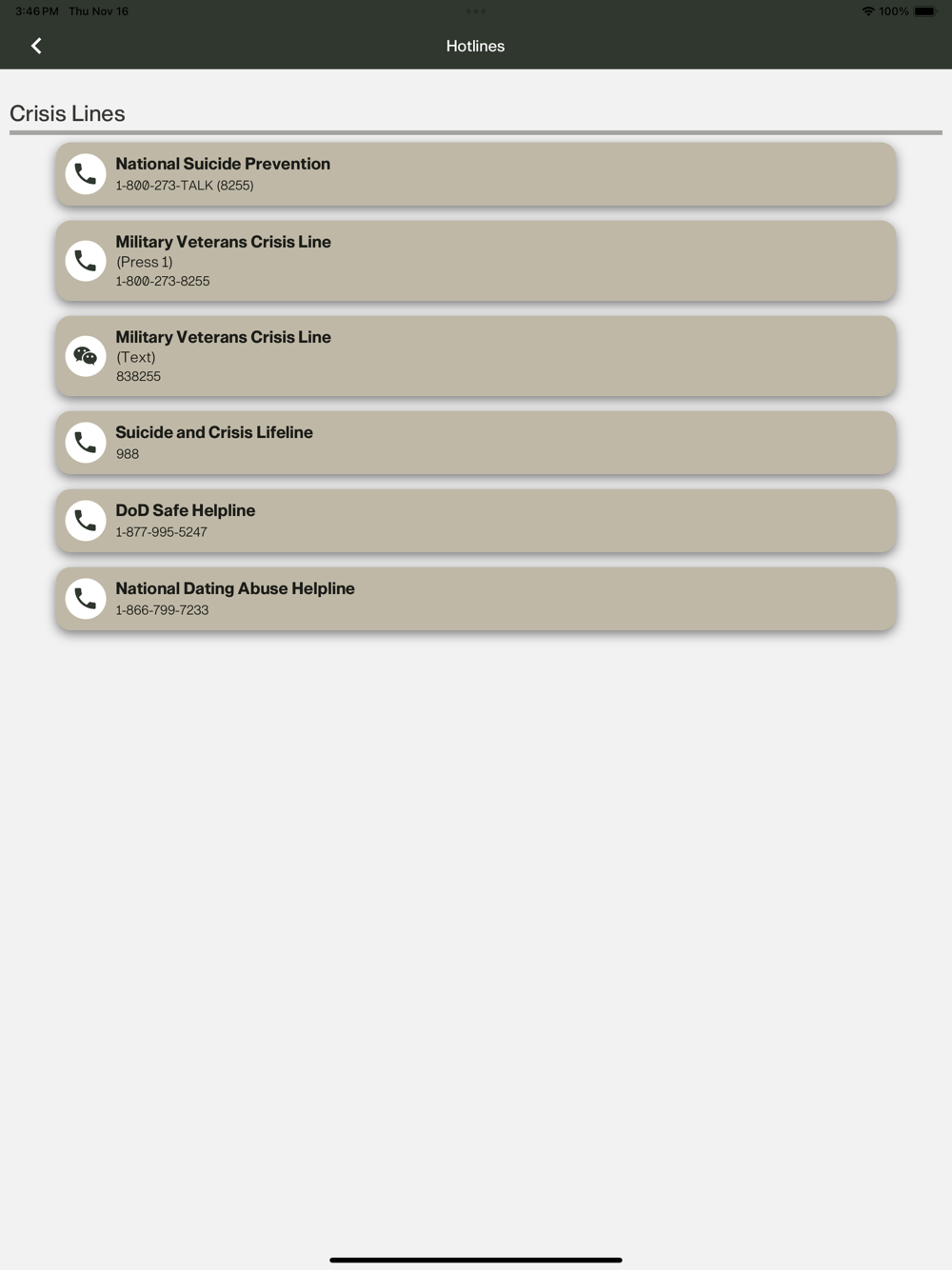 This app is to support the Army Sustainment Command and U.S. Army's Domestic Abuse, Suicide / Sexual Assault Prevention Campaigns and serves as an educational and resource tool readily available to the user to recognize and help reduce high risk behaviorswith the ultimate goal of eliminating abuse, sexual harassment, and sexual assault amongst our ranks.The app allows its users who are aware of, witnesses to, or involved with a high risk behavior the ability to have points of contact and resources readily available with one click of a button. The main features of the application are an emergency dialer and points of contact on a one-touch dial.