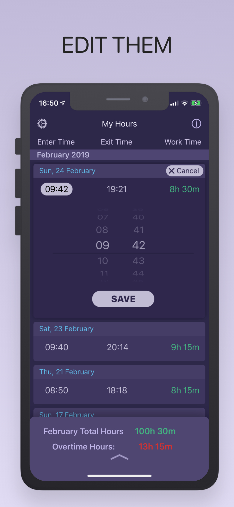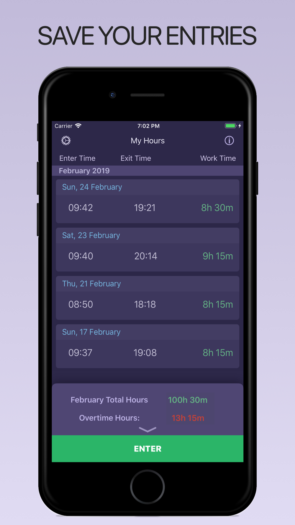 Simply tap "Enter" and go to work, the app will automatically calculate your breaks, and finally "Exit".