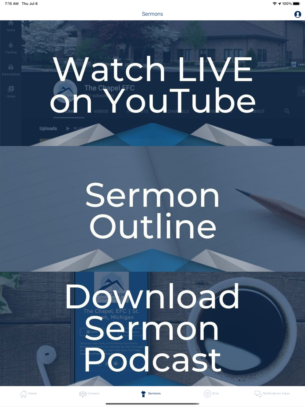 The Chapel, EFC is a growing church in St. Joseph, Michigan made up of individuals and families like you who care for and support one another with the love of Jesus Christ. We'd love to connect with you! Download the app to find upcoming events, sermons, giving opportunities, and more. We hope that you will find The Chapel as your place to belong.