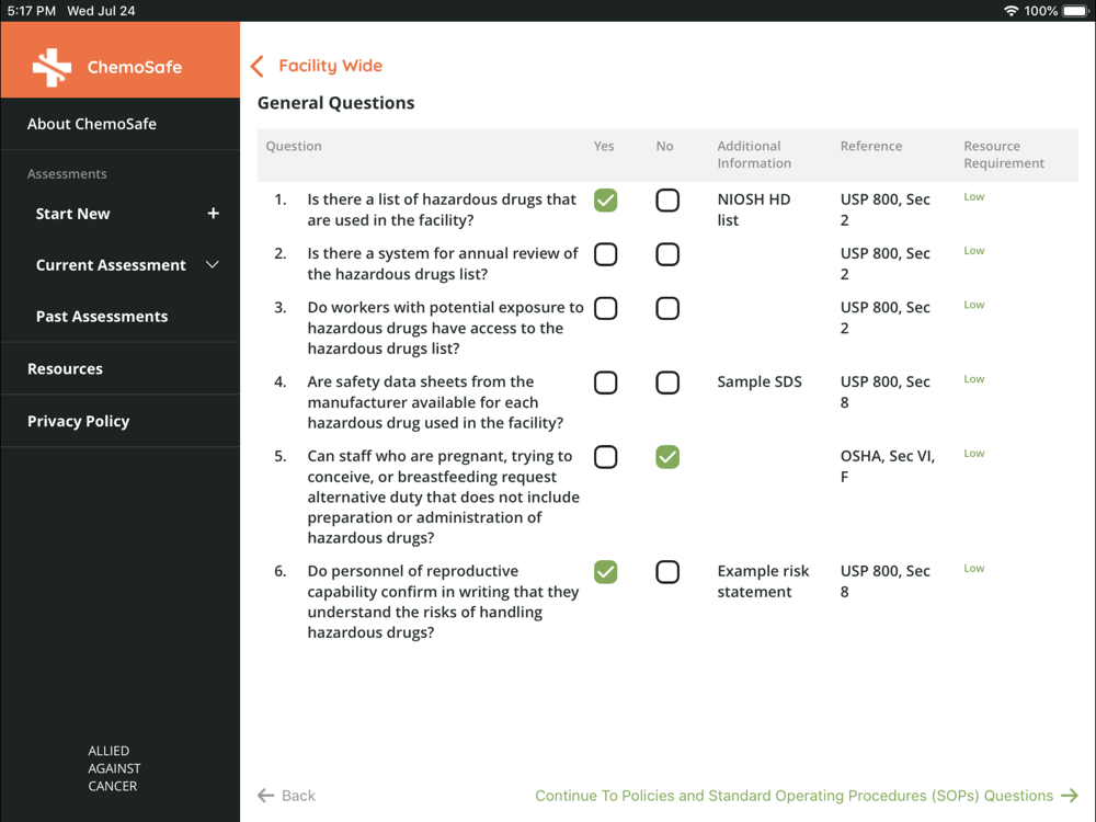ChemoSafe enables you to evaluate how hazardous drugs are handled at every point of interaction in your healthcare facility, and benchmark current practices against international standards for safety and quality. With recommendations about how to improve safety, you can develop action plans to minimize harmful exposure to hazardous drugs for health workers and patients.