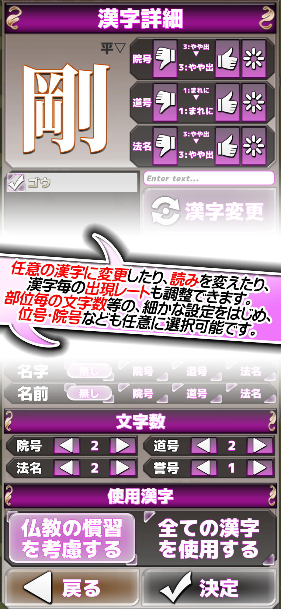 ・院号、道号、戒名、誉号などの字数を自由に変更可能な為、変則的な戒名も生成可能。