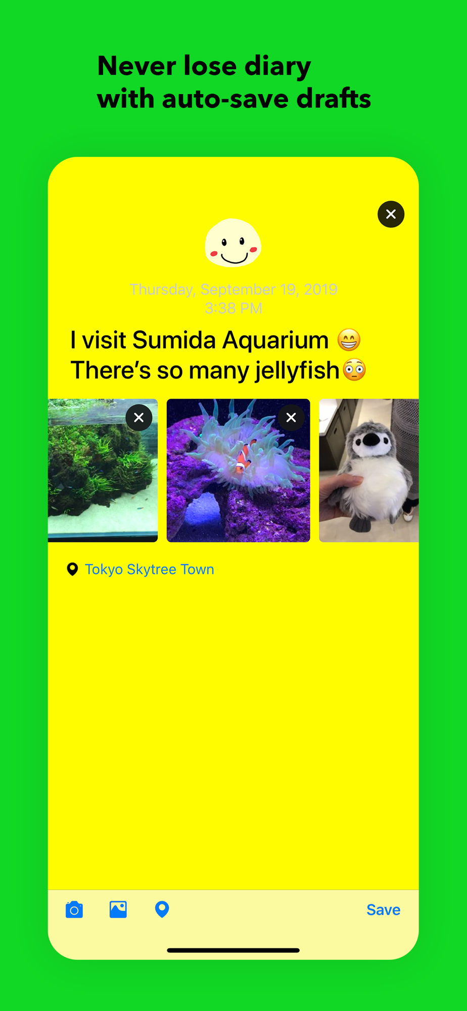 Choose your mood from adorable faces and optionally write note, attach photos, videos and location.