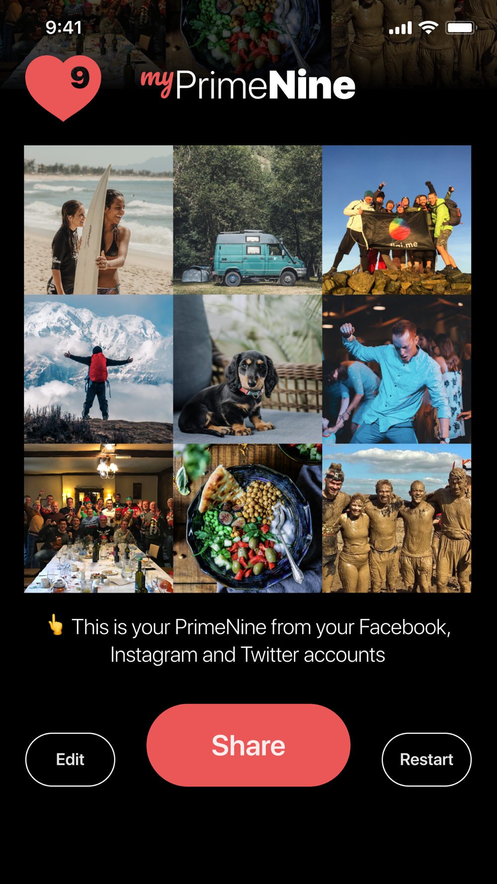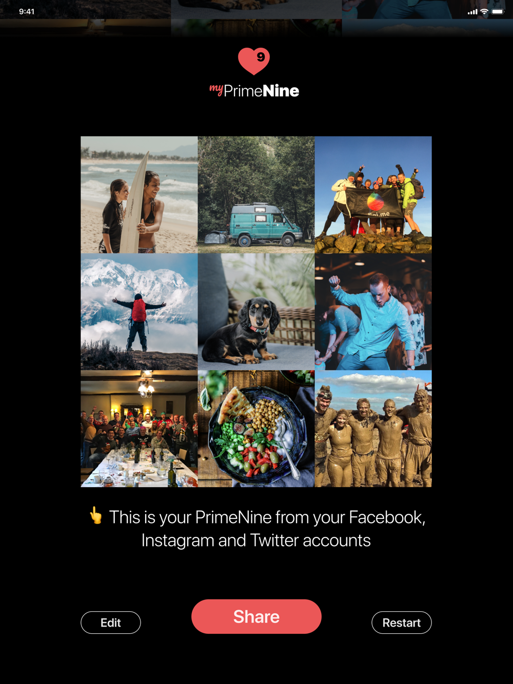 myPrimeNine lets you find and share your most popular photos from all your social networks - Instagram, Facebook, Twitter, Pinterest and Flickr. You’ll get a single shareable image with your top 9 photos. Include us @myprimenine, and we might retweet it :)