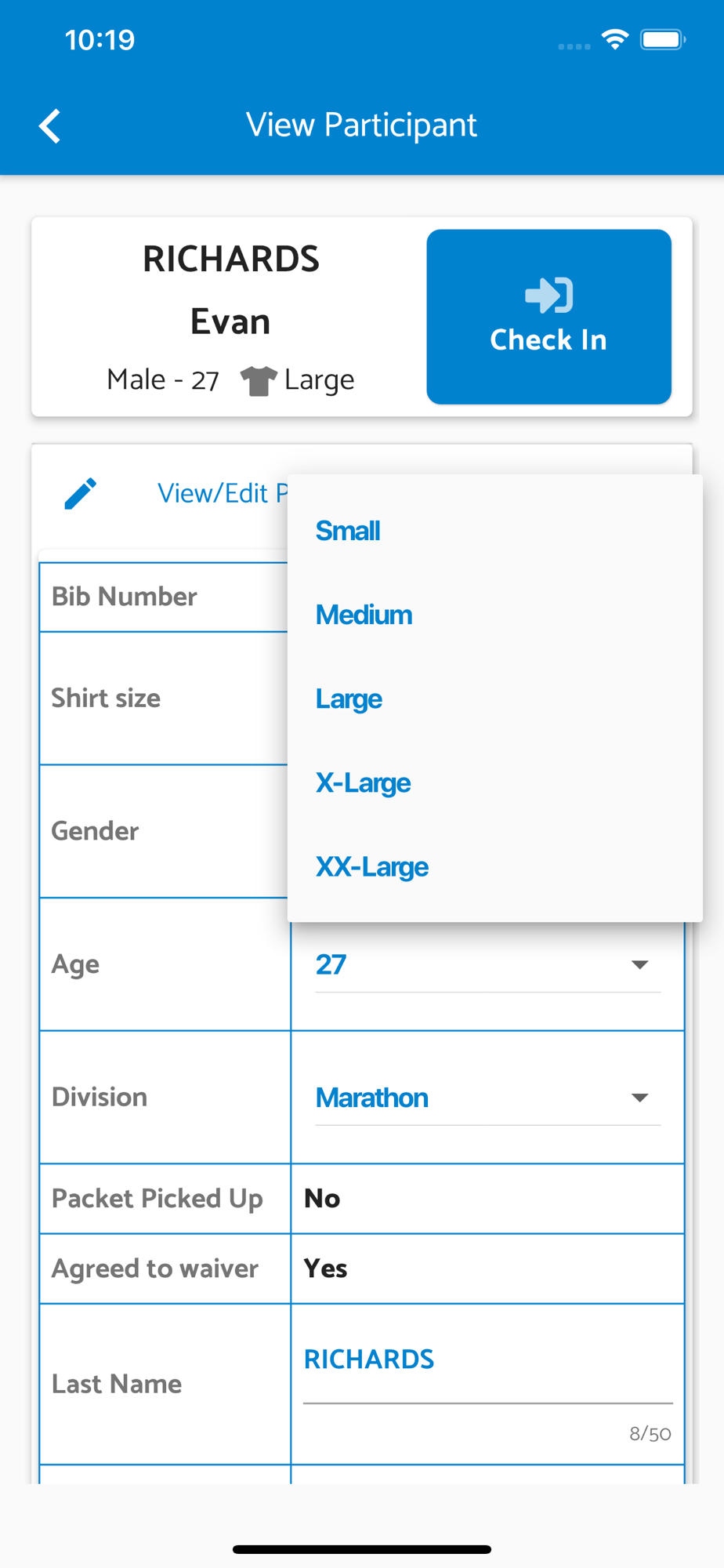 A mobile app that can be used by volunteers at an event to check in registered athletes and assign bib numbers. This app allows for a fast check-in process by the event’s volunteers. It also allows the timer to offer an easier process for dynamic bib assignment and lessens the time to prepare packets for race day.