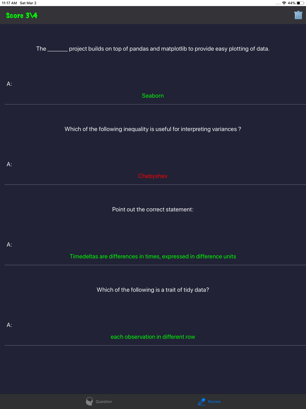 If you want to test your skills and knowledge for dataScience, here is the app for you! There are over 100 questions and you can instantly see the review by answering questions.