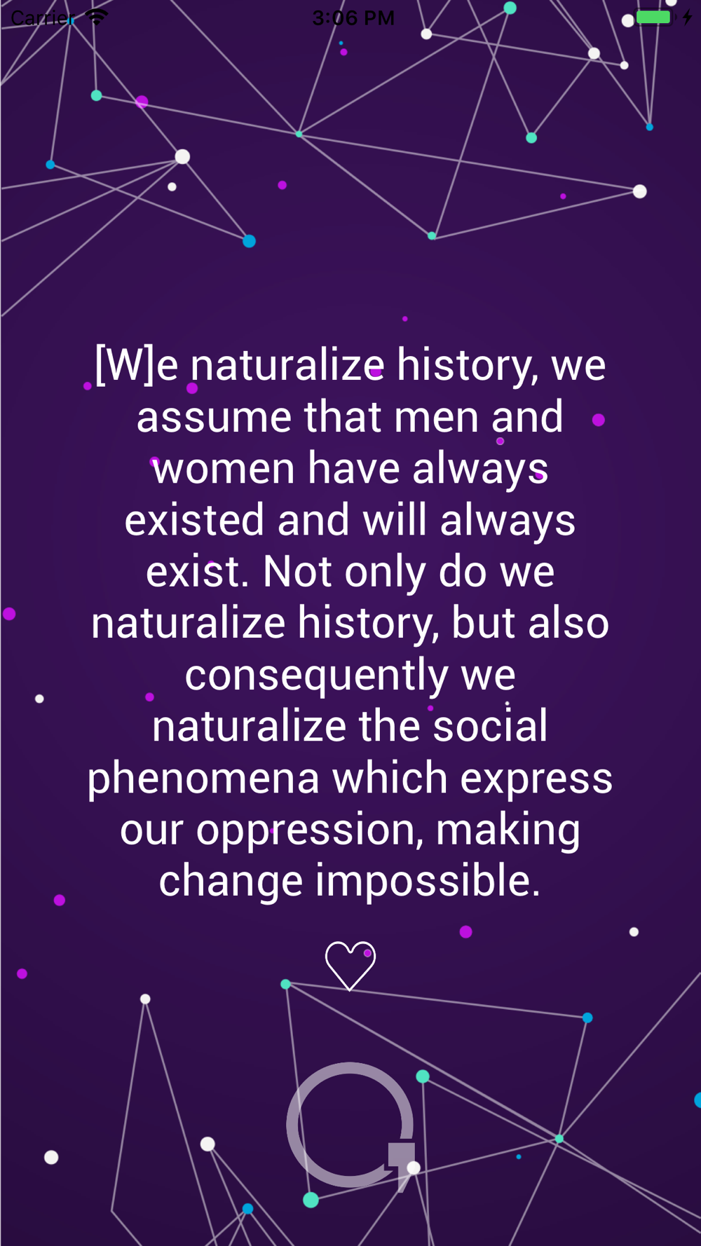 Quotidian is the smartphone app developed by the GRACE Smartphone App Design Group[1]. Quotidian is an interactive and multisensorial app that provides users with intersectional feminist quotes from all around the world. It was developed through a participatory design process involving the communities in which the GRACE researchers are embedded. Ideas were gathered from the bottom-up, leading to the development of the app concept, of a first prototype, and a growing collection of quotes.