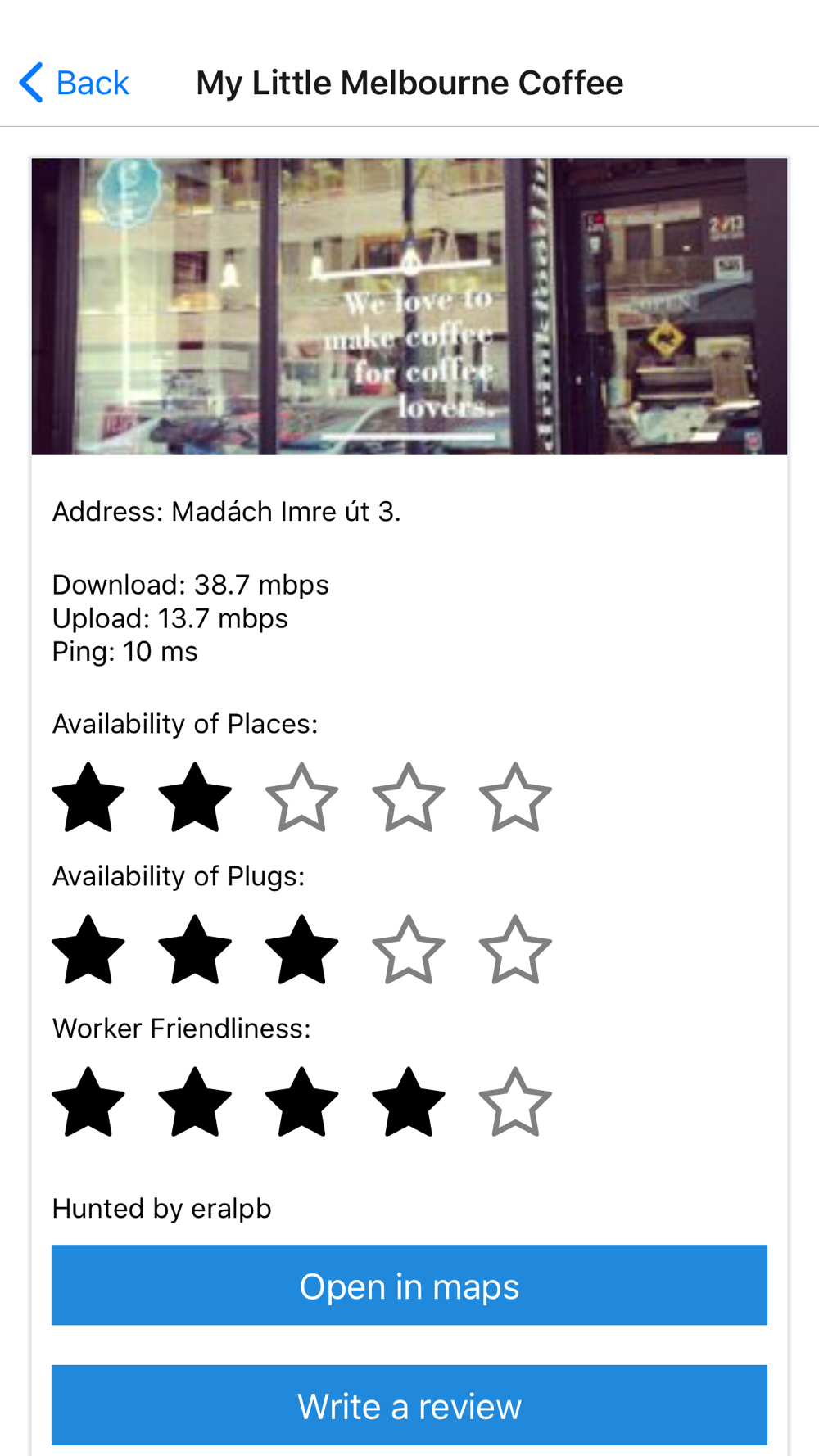 CafeSpeeds is crowdsourced collection of remote worker friendly cafes and it's currently betaing in Budapest!