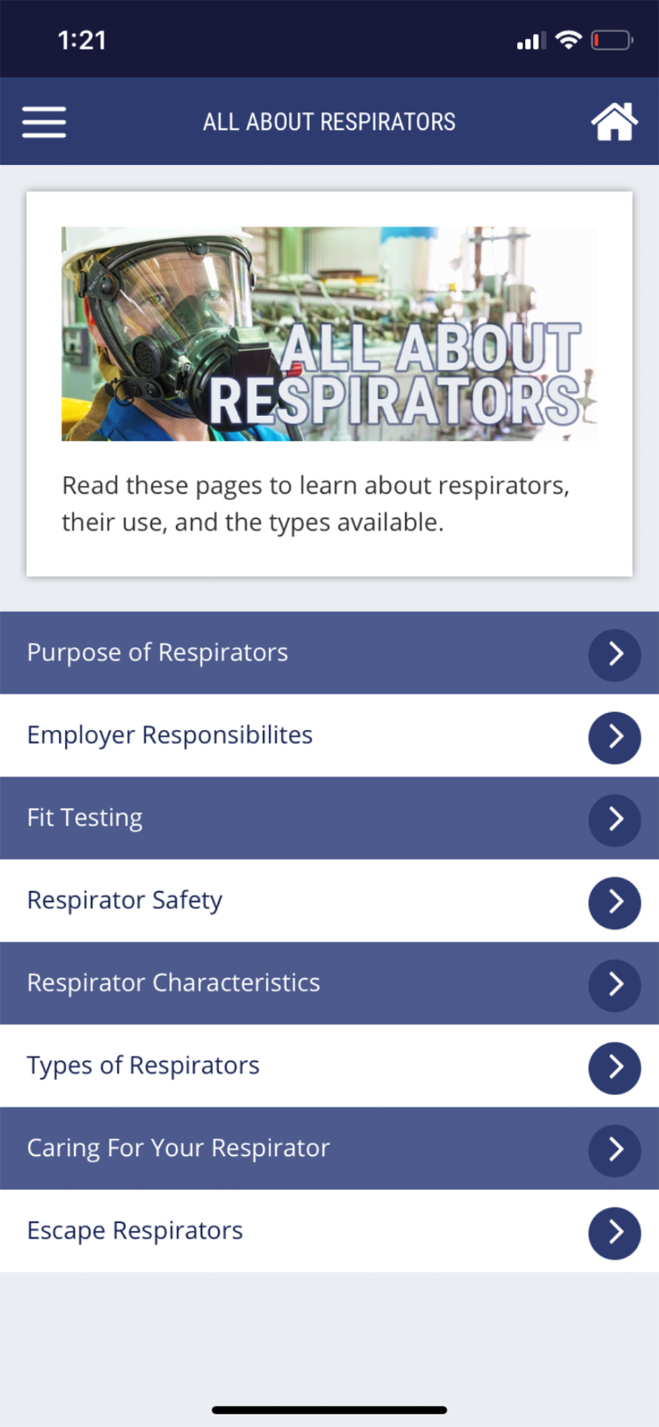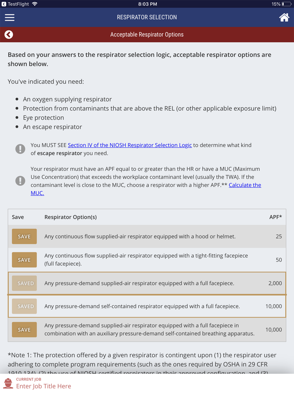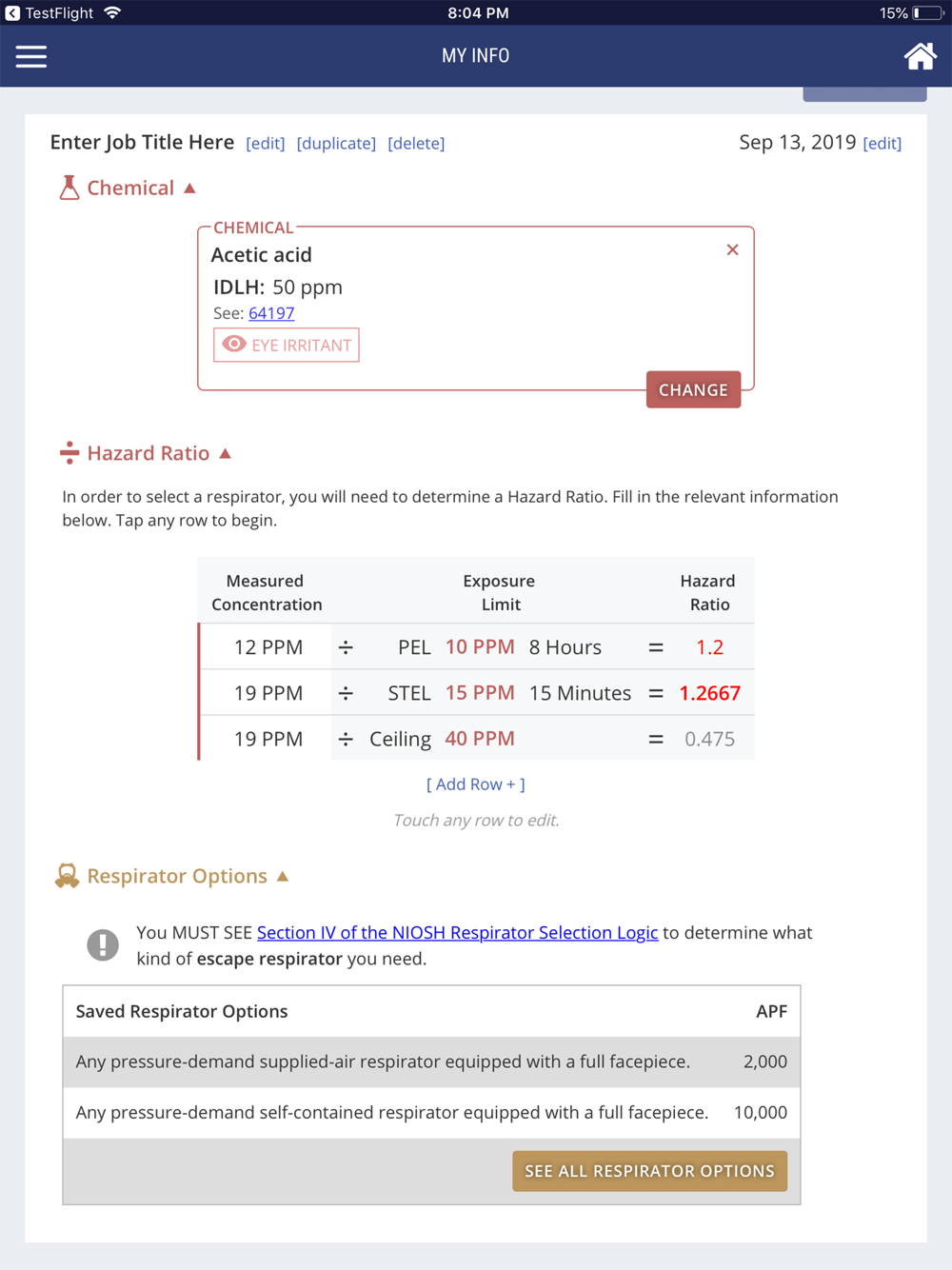 - My Info: Keep track of job details (i.e. date, chemicals, workplace air contaminants, and applicable respirator options).