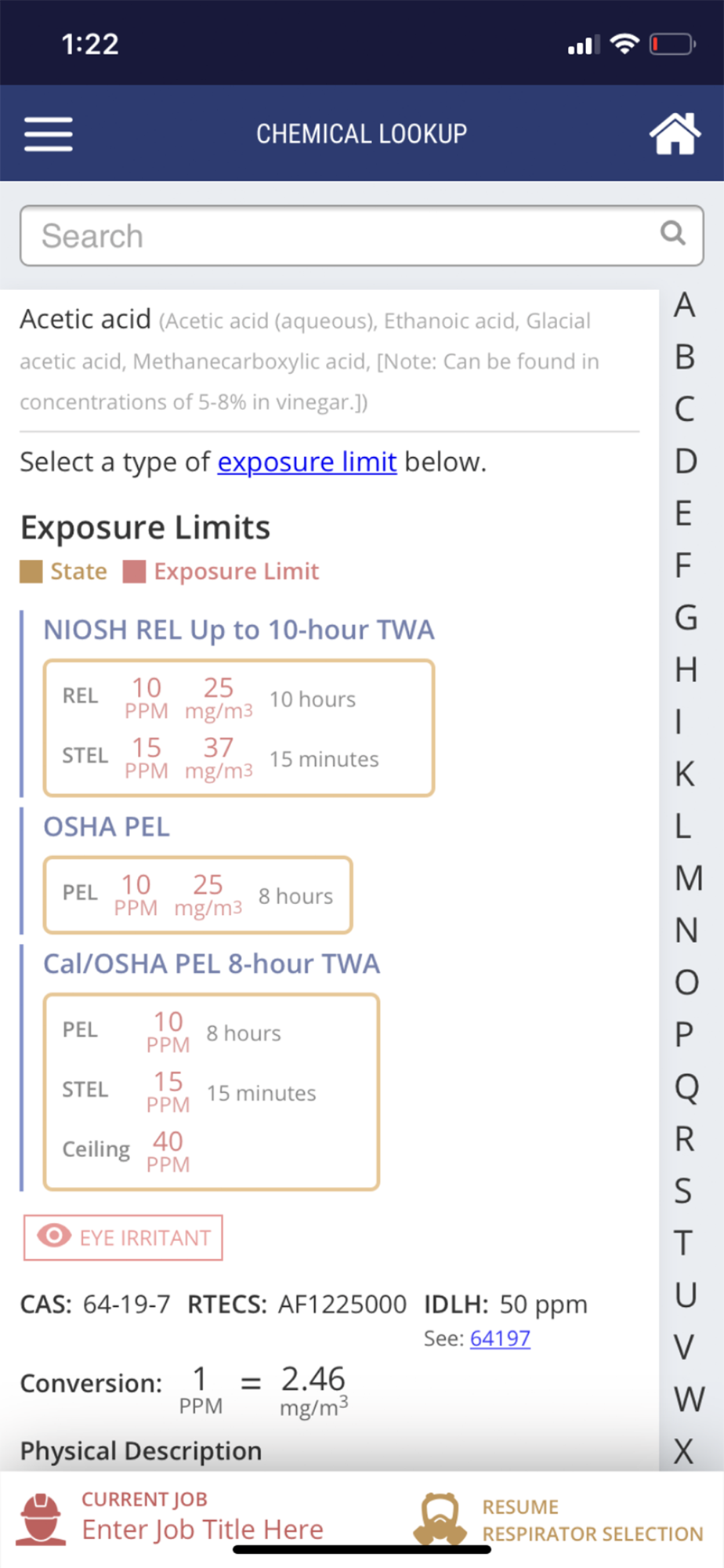 Choosing the best respirator for the job made easy! Find the chemical(s) you're working with from a list of over 700 common workplace chemicals. Save the chemical's exposure limit(s) to your job profile and record the amount of air contamination at your worksite to calculate the level of protection needed. Selecting the best respirator model is easy-- just answer a few Yes/No questions and get a list of acceptable respirator options. Learn about the different types of respirators, how to fit test and user seal check a respirator, and how to care for your respirator. Download this app and make protecting yourself from respiratory hazards do-able!