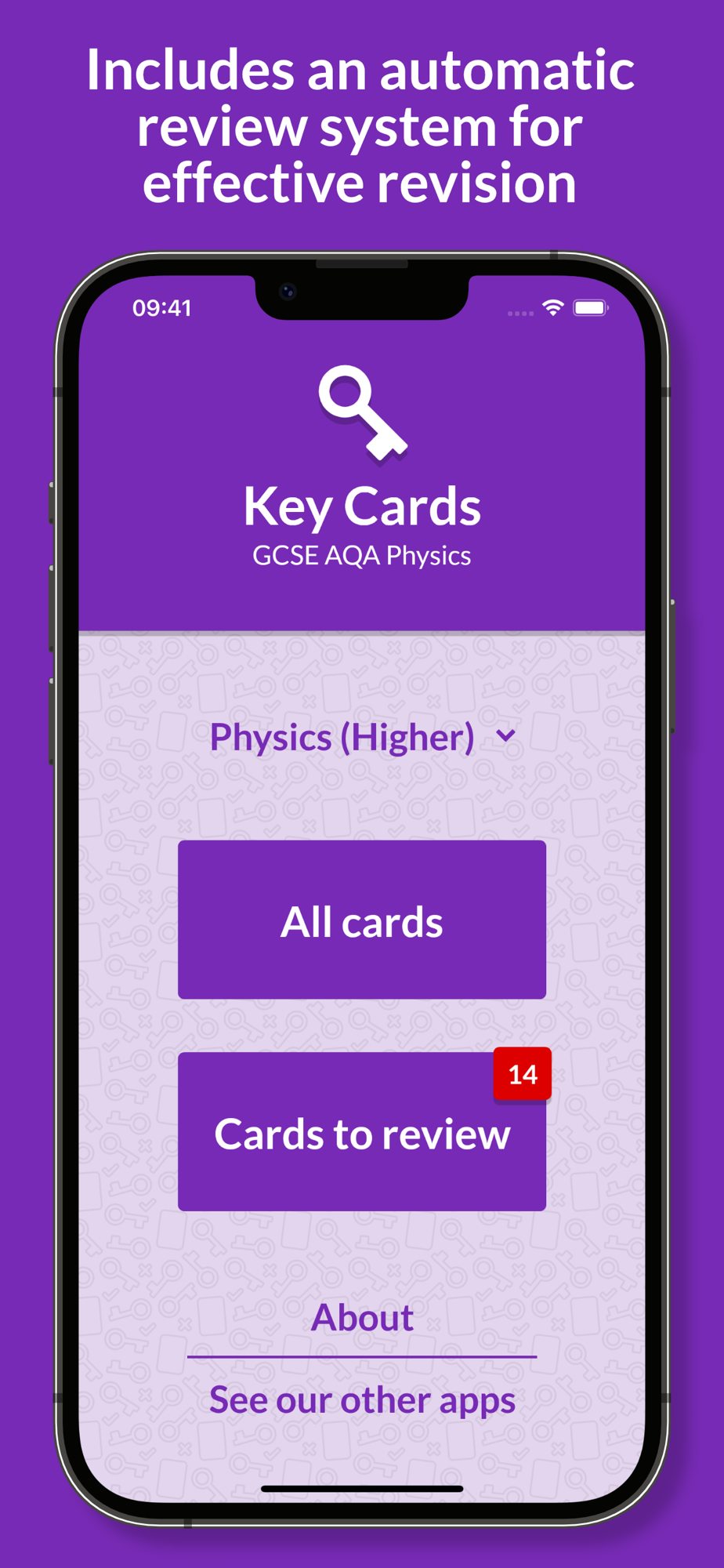 The key to remembering facts, processes and concepts is to review them repeatedly over time. That sounds like a hassle, but Key Cards apps include an automatic review system for effective revision. All you need to do is answer the cards and you'll be told when to look at them again.